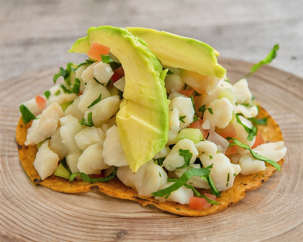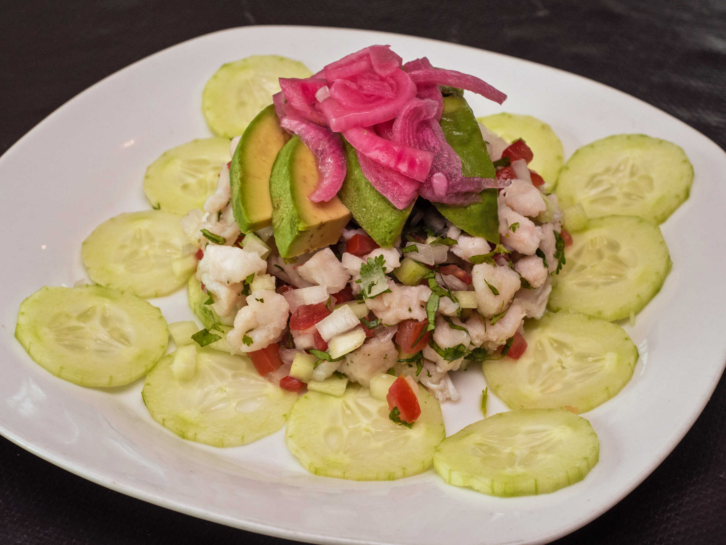 Pescado macerado en limón con pico de gallo y pepino con láminas de aguacate
