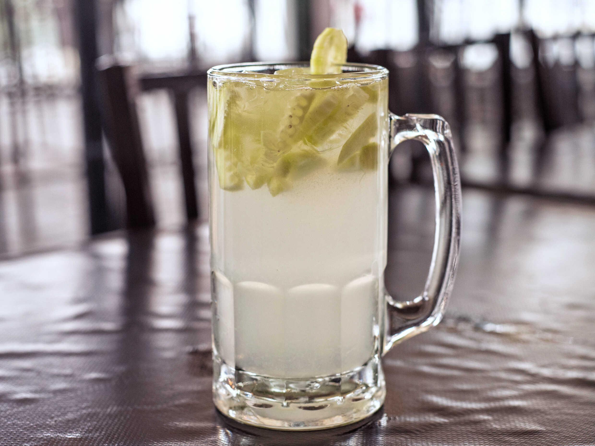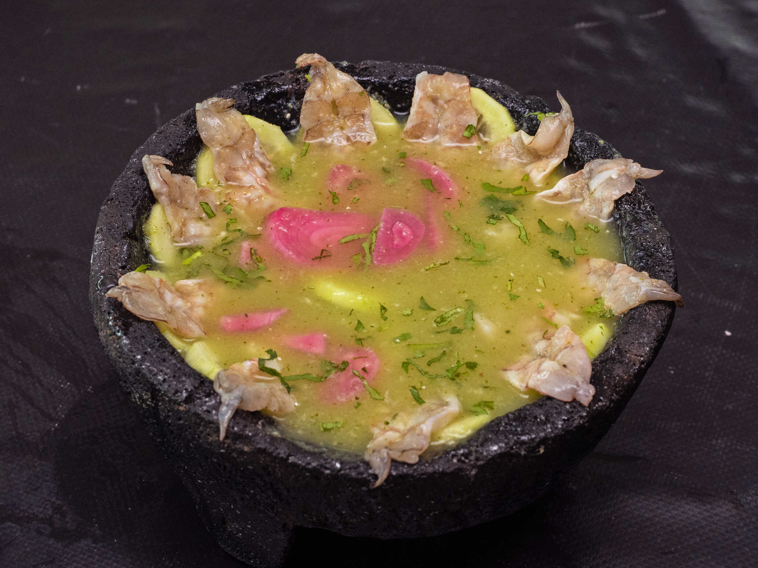 Camarón aguachile macerado en limón, pepino, cilantro, chile serrano y láminas de pepino