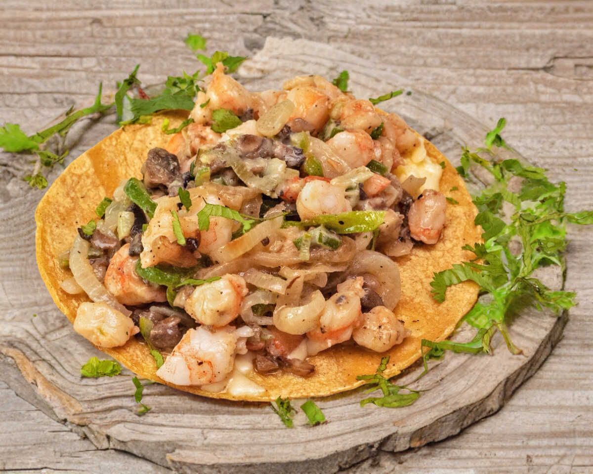 Tortilla normal con guiso de camarón estilo gobernador con queso gratinado