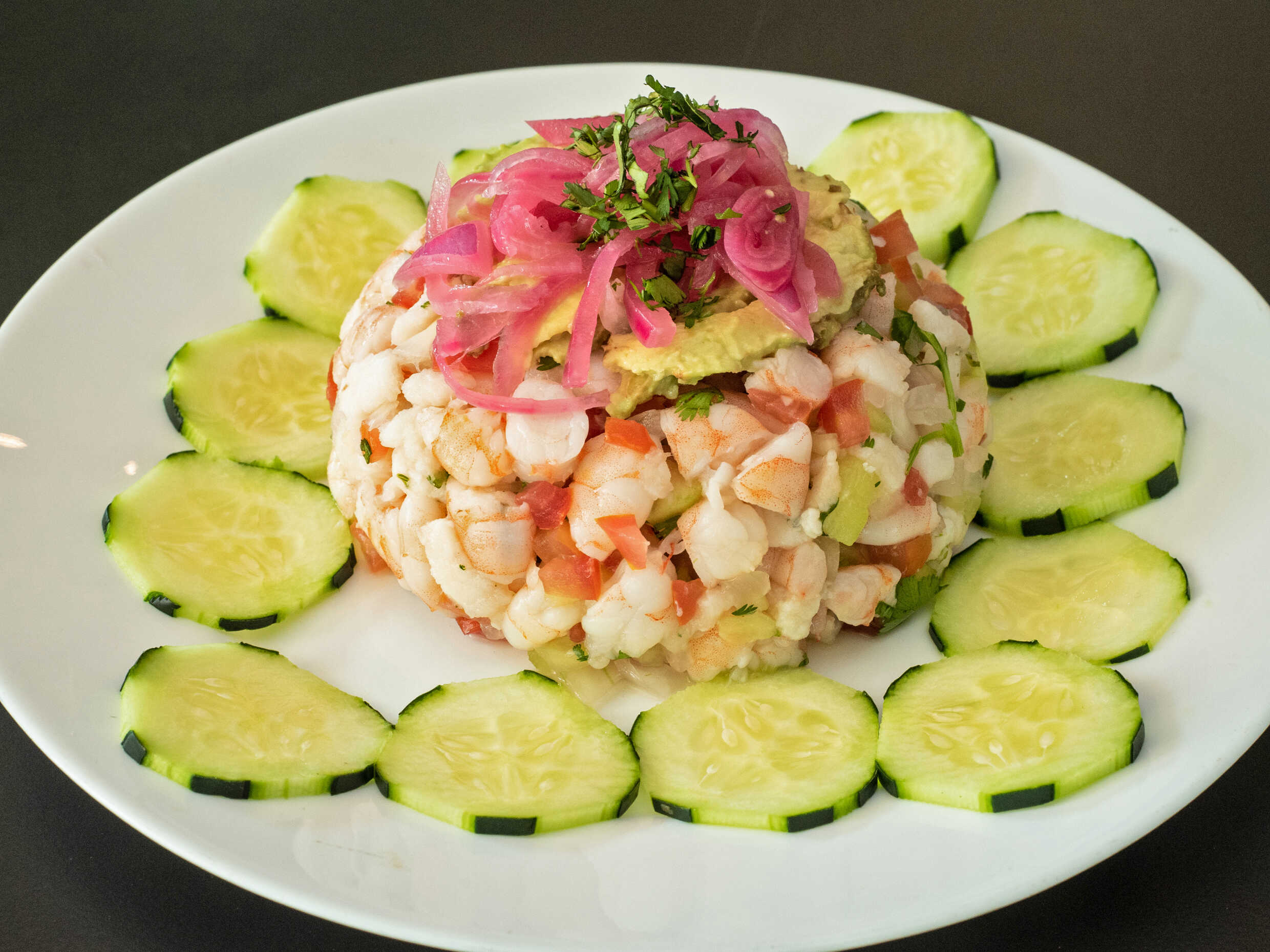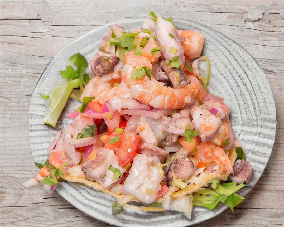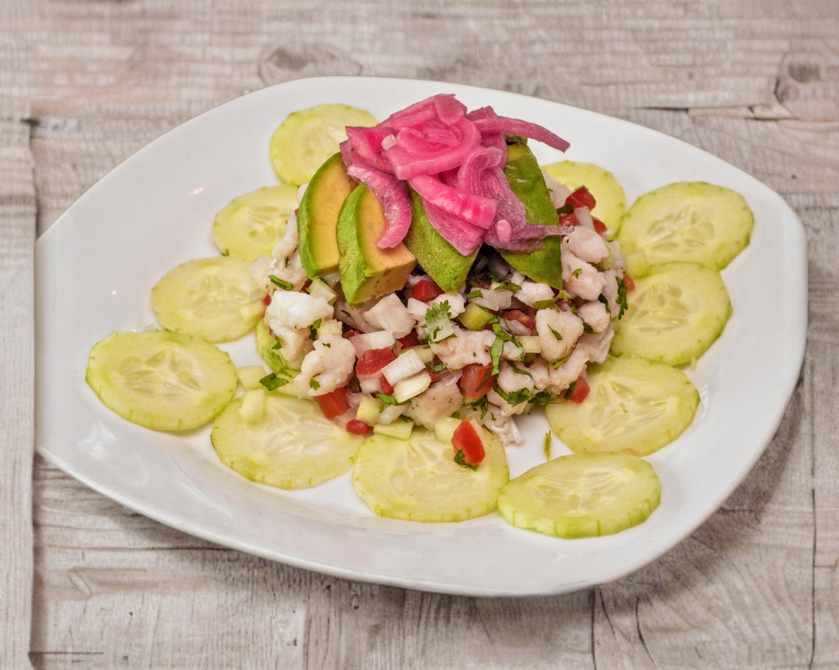 Ceviche de pescado y camarón cocido macerado en limón, pepino, tomate, cebolla y láminas de aguacate