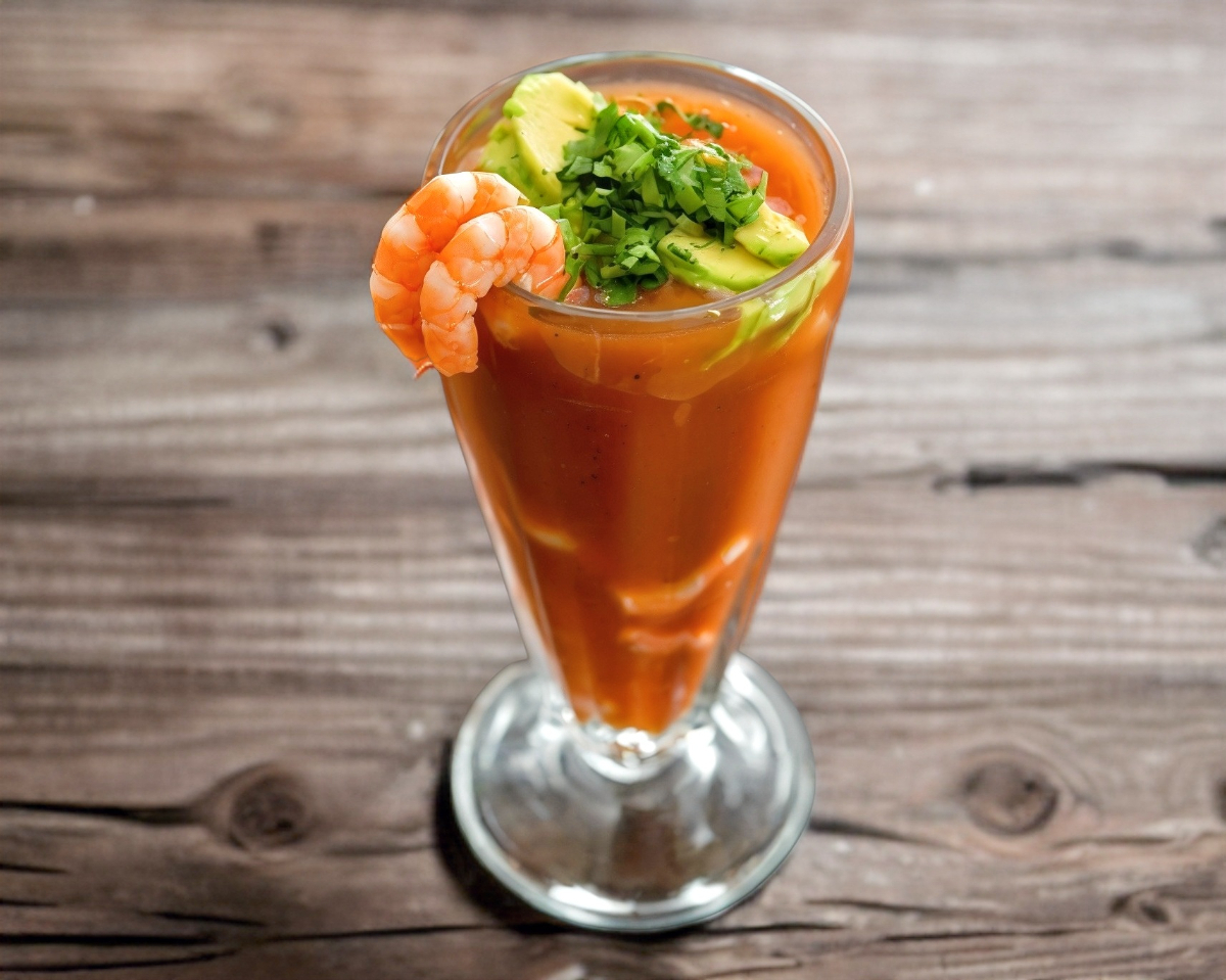 Medio litro a base de salsa marinera con catsup, camarones cocidos, cebolla, cilantro, tomate y aguacate