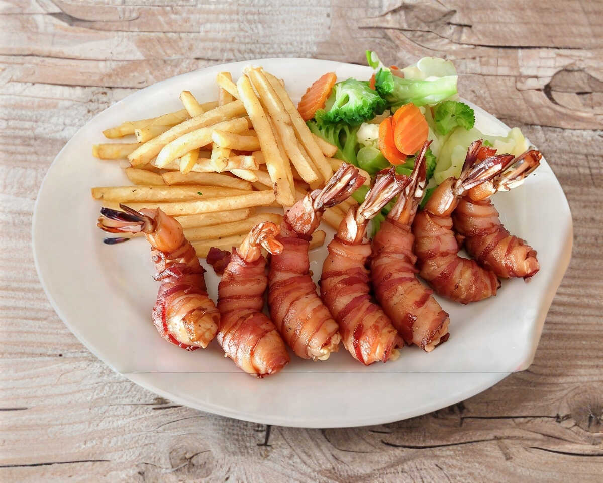 7 Camarones envueltos en tocino y gratinados, acompañados de arroz, papas francesas y ensalada