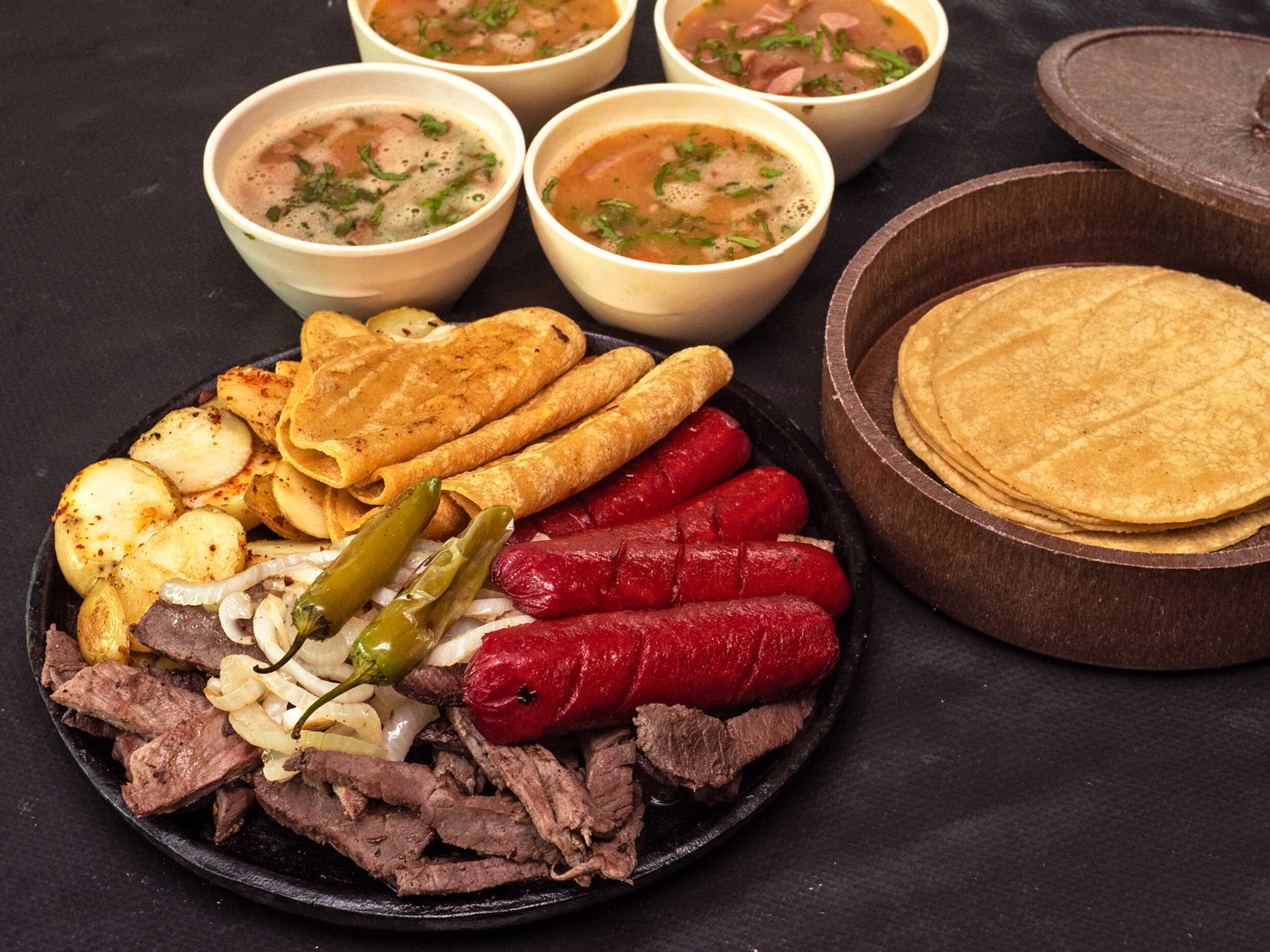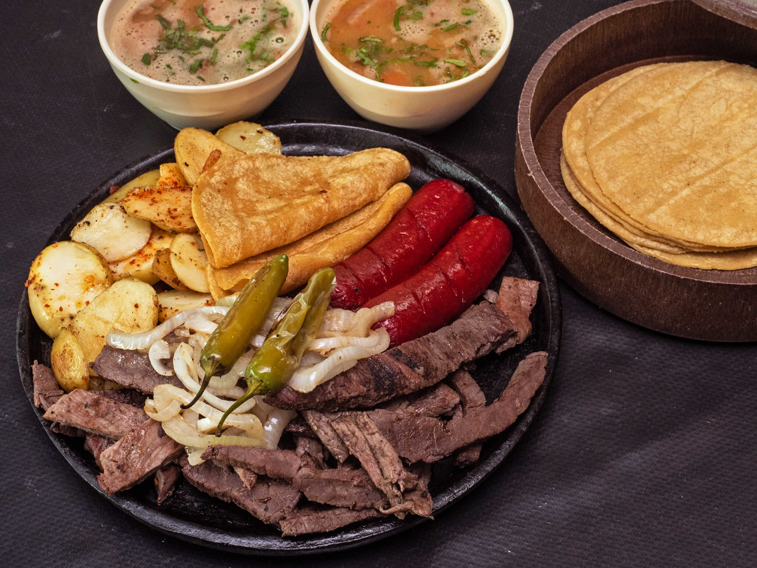 Parrillada Top Sirlon de medio kilo acompañada de papas galeana, salchicha asada, frijoles charros, quesadillas y cebolla asada.