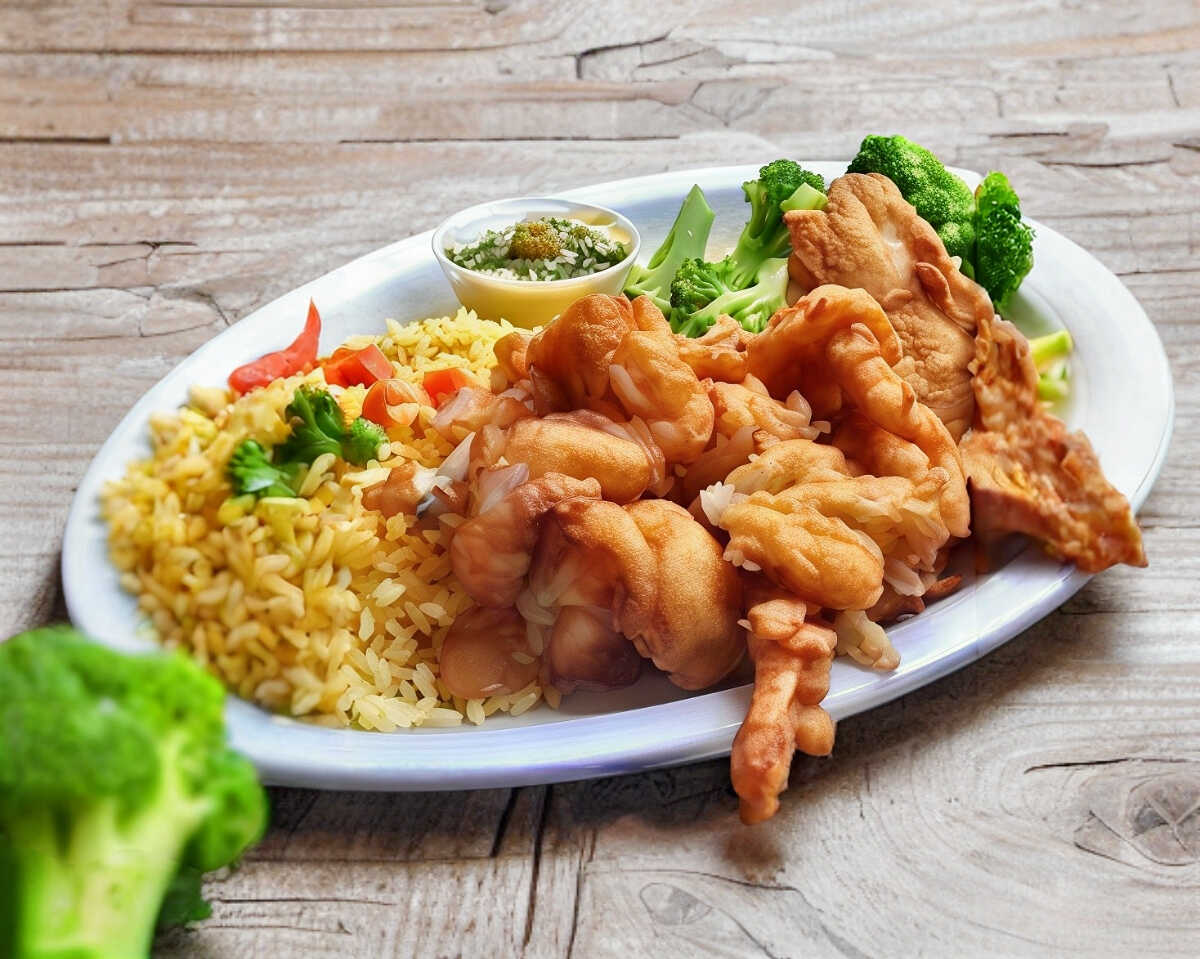 Incluye 1 filete empanizado 5 piezas de camarones empanizados, arroz, papas francesas y ensalada