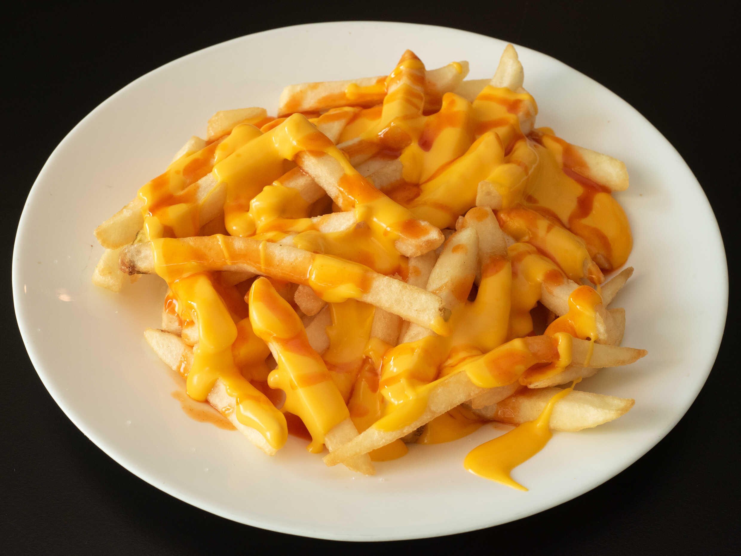 Papas francesas bañadas con queso amarillo y salsa de alitas