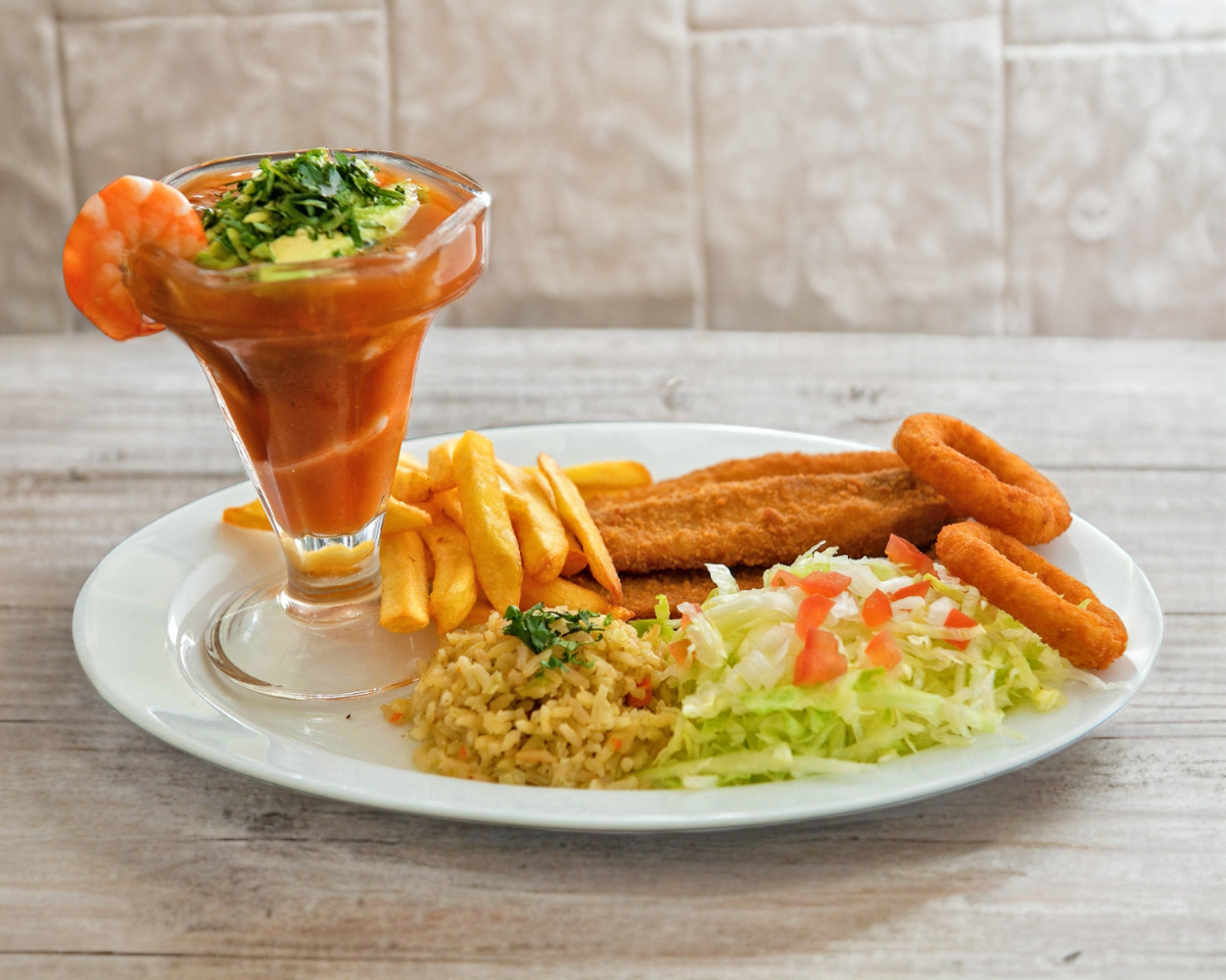 Filetes empanizados, camarones empanizados, aros de cebolla, filete a la diabla, papas a la francesa, arroz y ensalada.