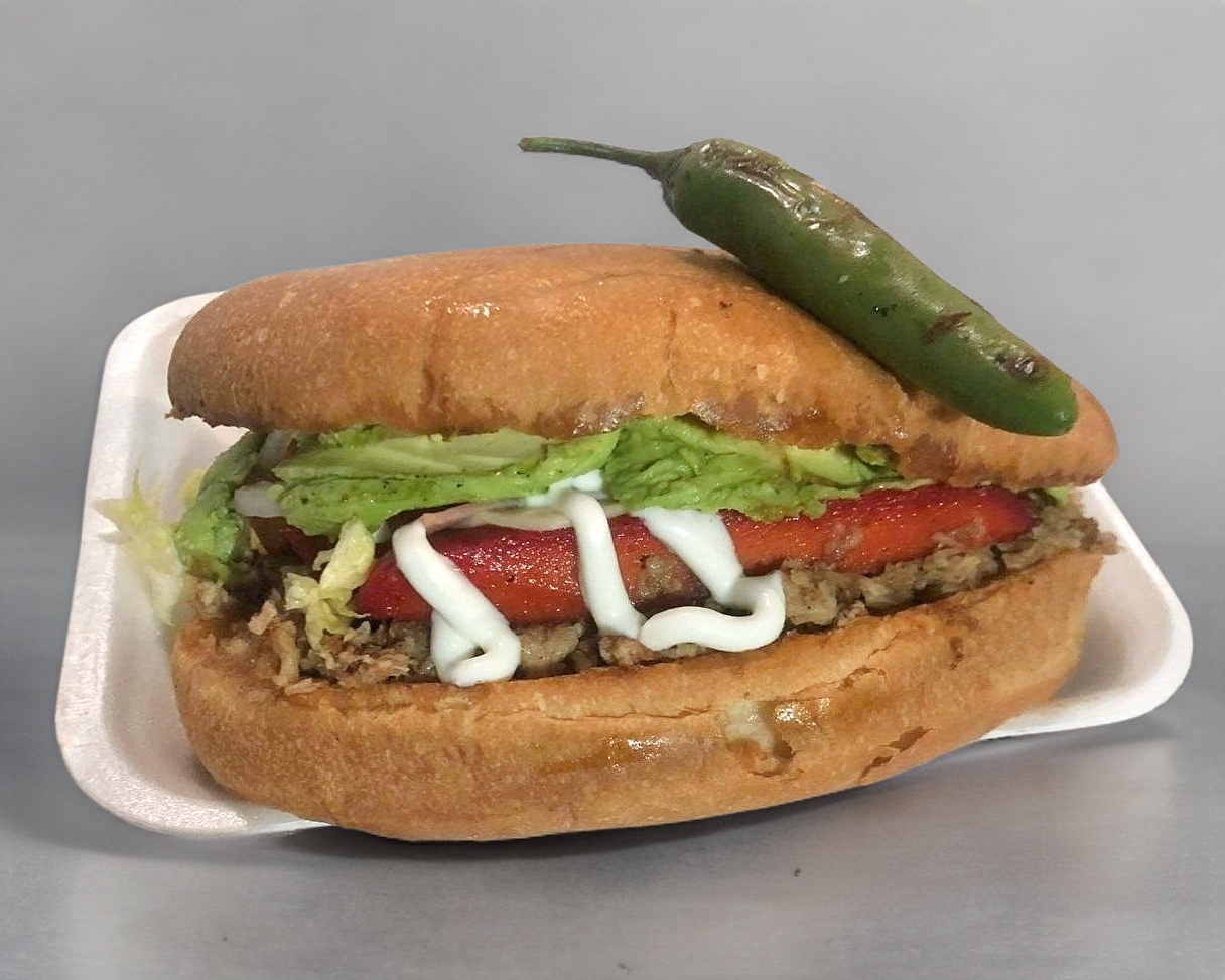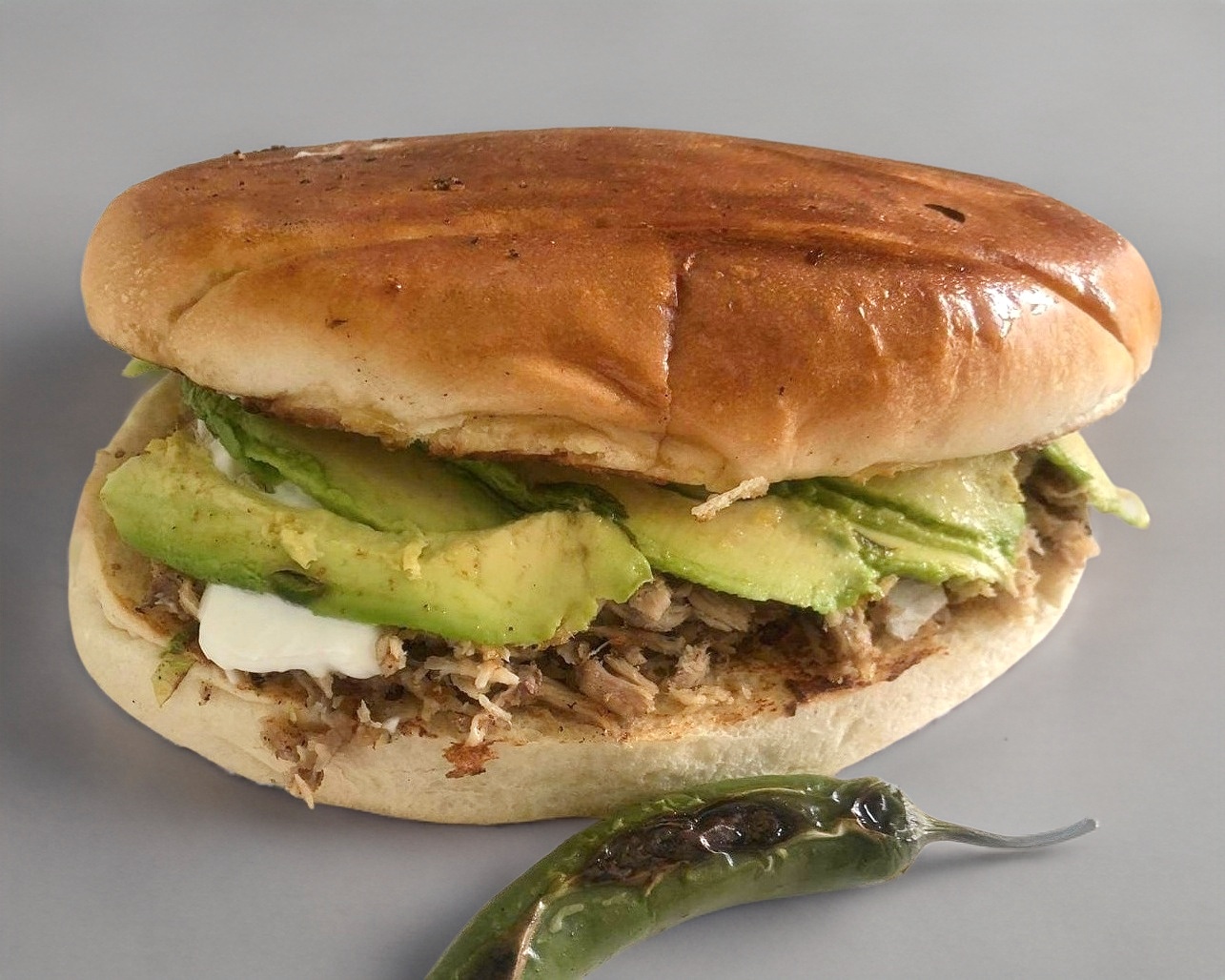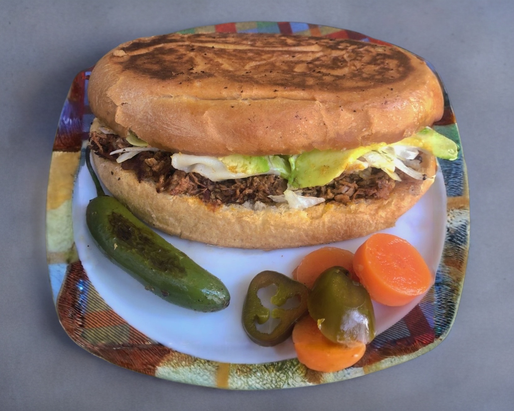 Pierna adobada, aguacate, crema, jamón, queso, frijoles refritos, lechuga, tomate y cebolla