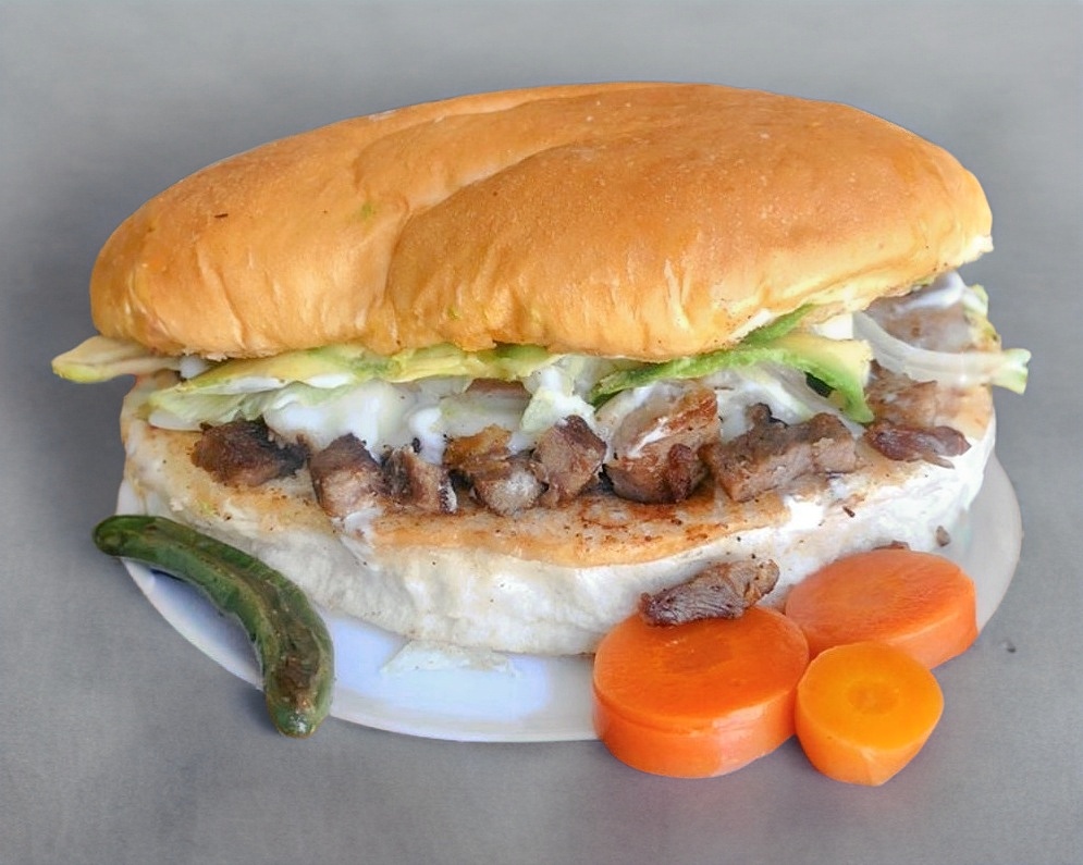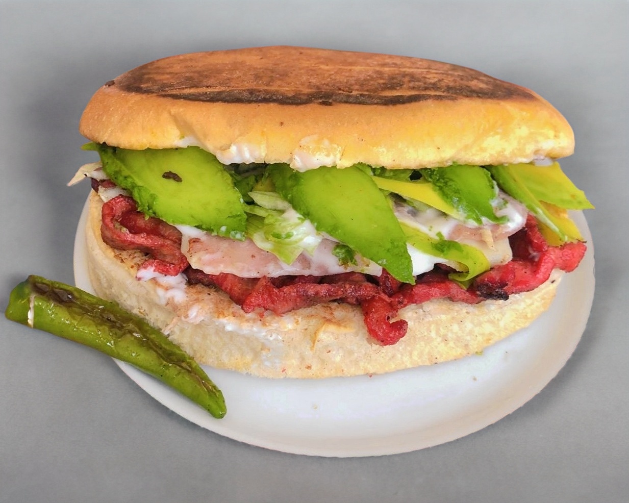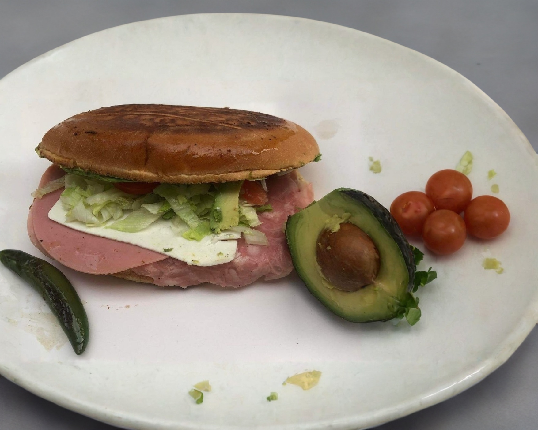 Jamón, mortadela, queso panela, queso de puerco, pastel pimiento, aguacate, lechuga, tomate, cebolla y mayonesa
