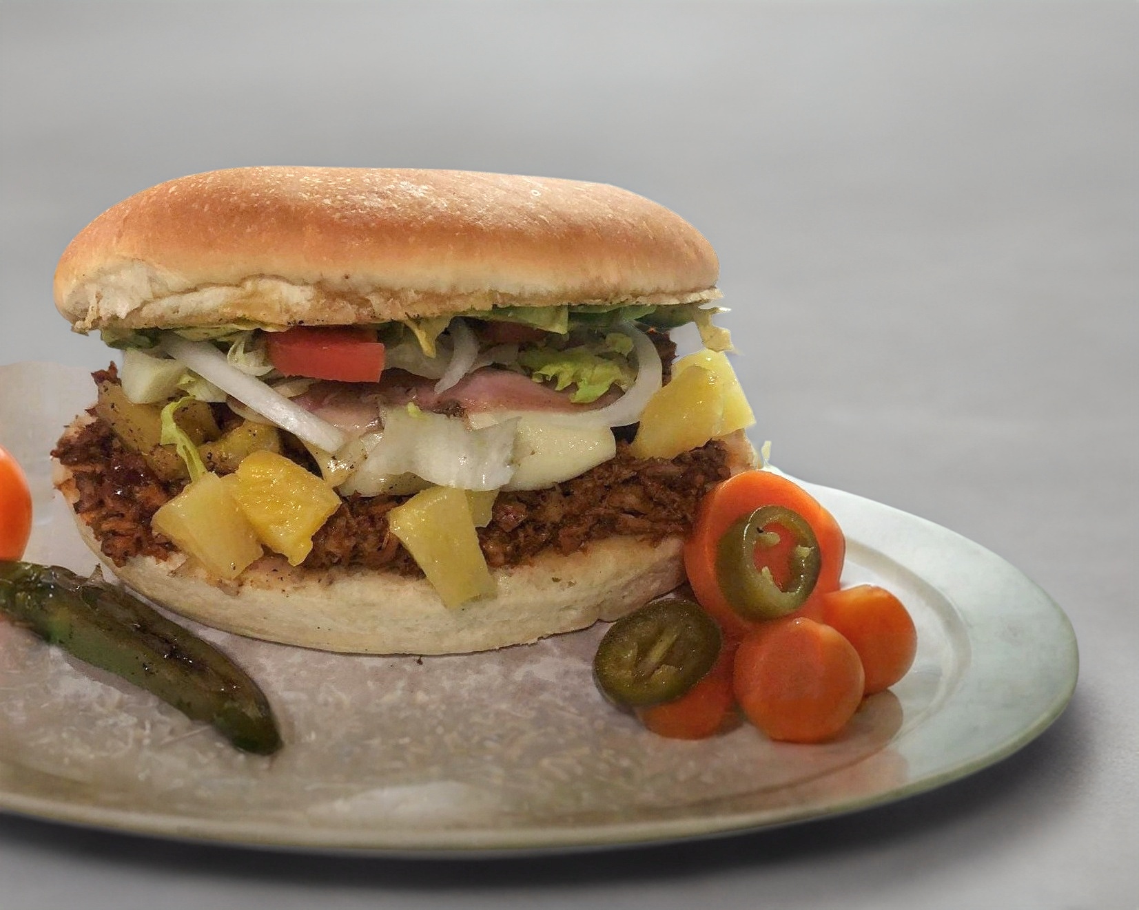 Pierna adobada, piña asada, aguacate, crema, jamón, queso, frijoles refritos, lechuga, tomate y cebolla