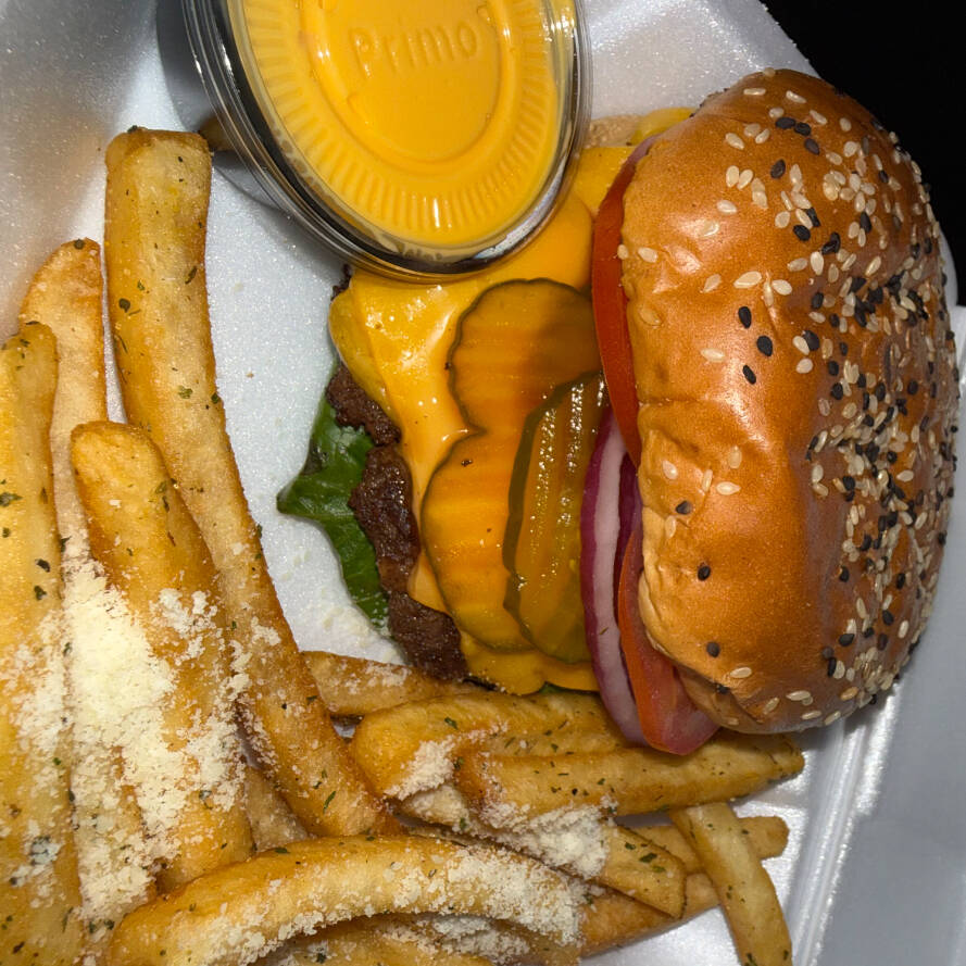 Hamburguesa con 150 gramos de carne casera,mayonesa,capsu,Queso,lechuga,cebolla,tomate,pepinillos, + una orden de papas
