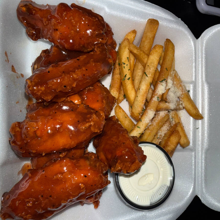 Medio kilo de Alitas bañadas en tu salsa favorita acompañadas de su rica orden de papas sazonadas y espolvoreadas con parmesano + 1 Dip Ranch