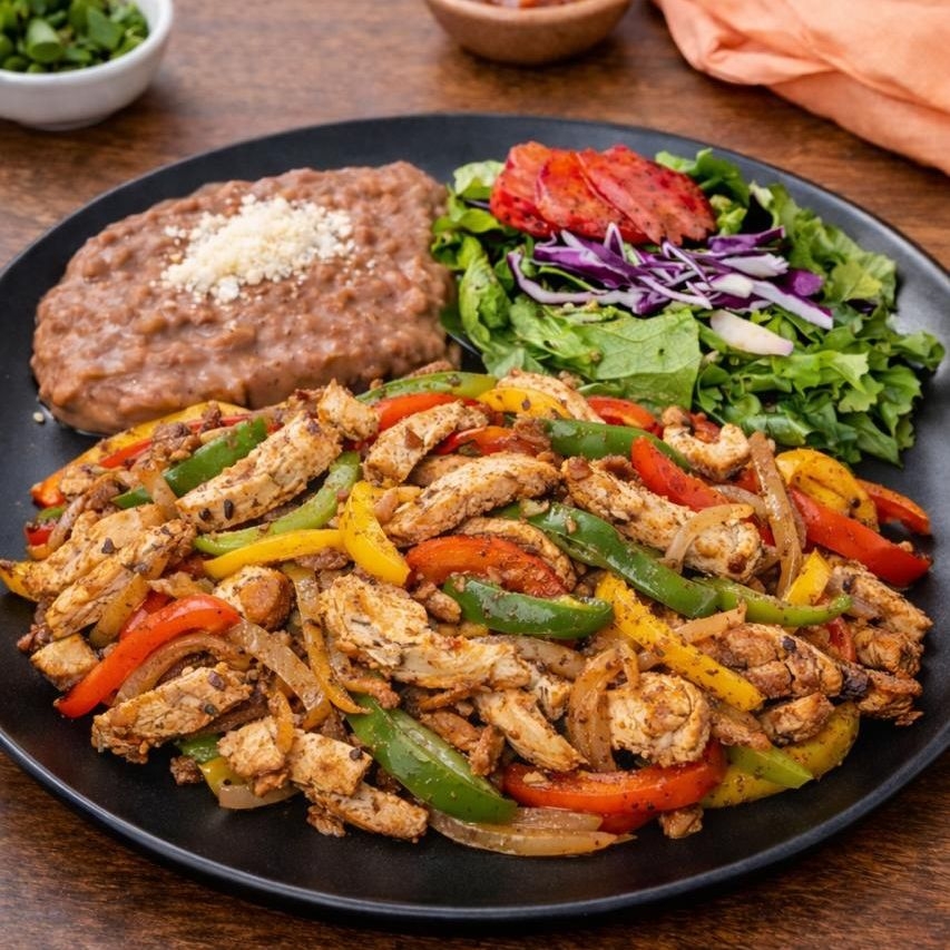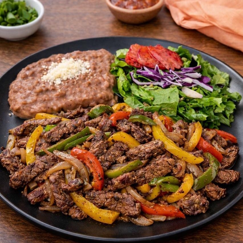 Proteína preparada con pimiento morrón y cebolla. Incluye frijoles, ensalada y tortillas o totopos.