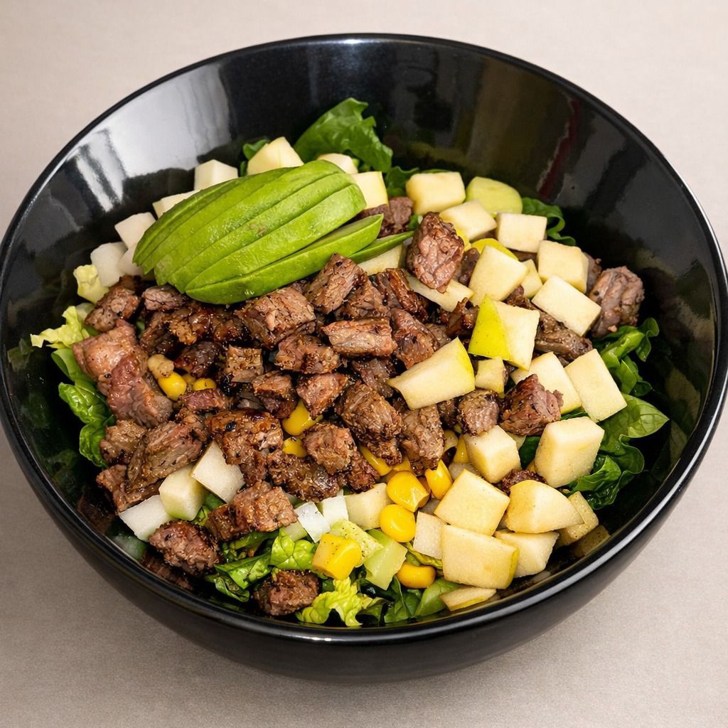 Fajita de carne, lechuga, pepino, tomate, jícama, manzana, elote, nuez y aguacate.