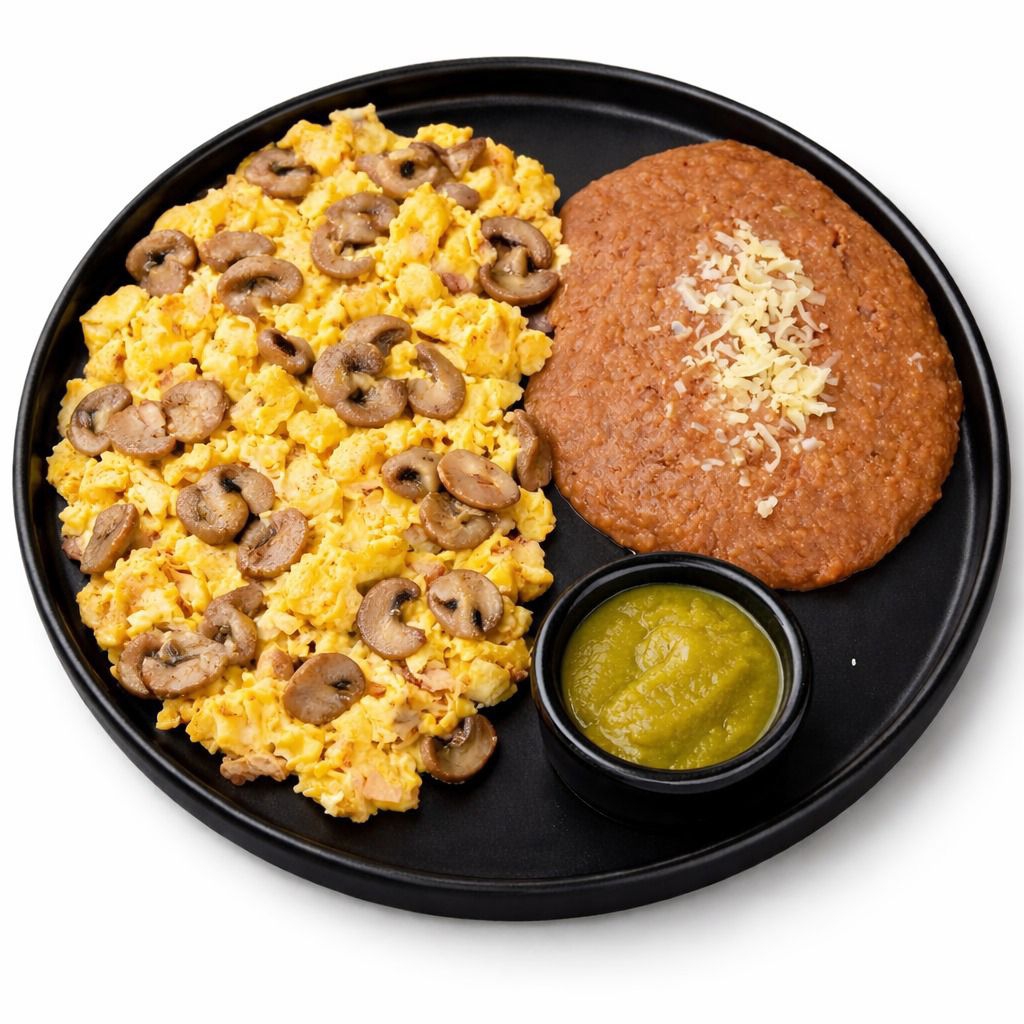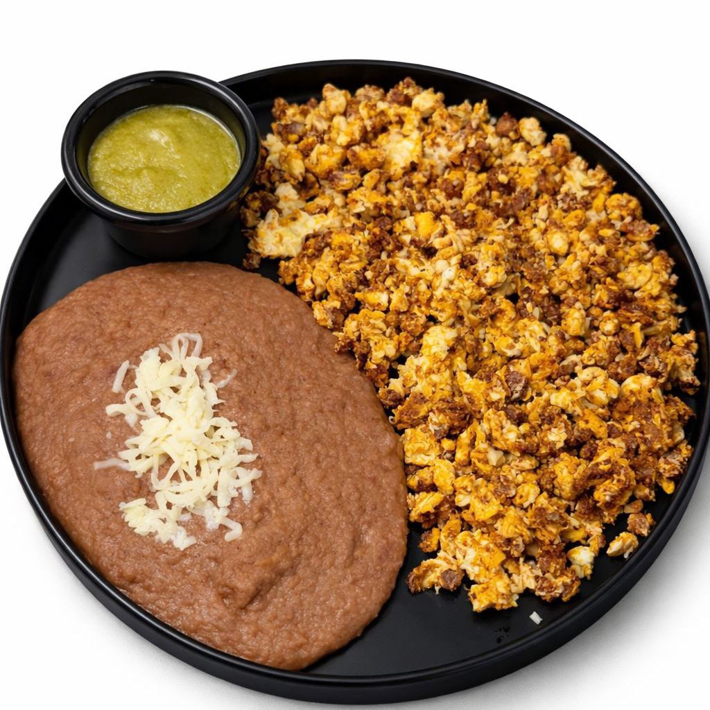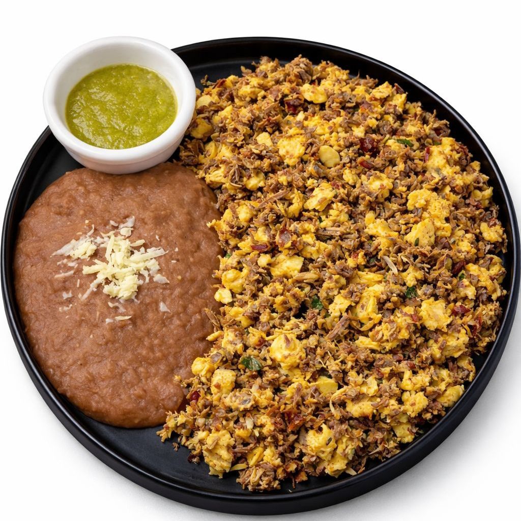 Huevo con machaca (puede incluir pico de gallo), acompañado de frijoles caseros.