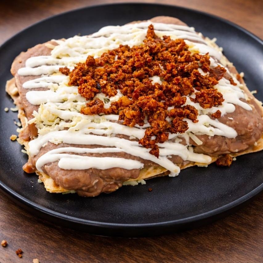 Tacos rellenos bañados con frijoles, queso y una capa de chorizo.