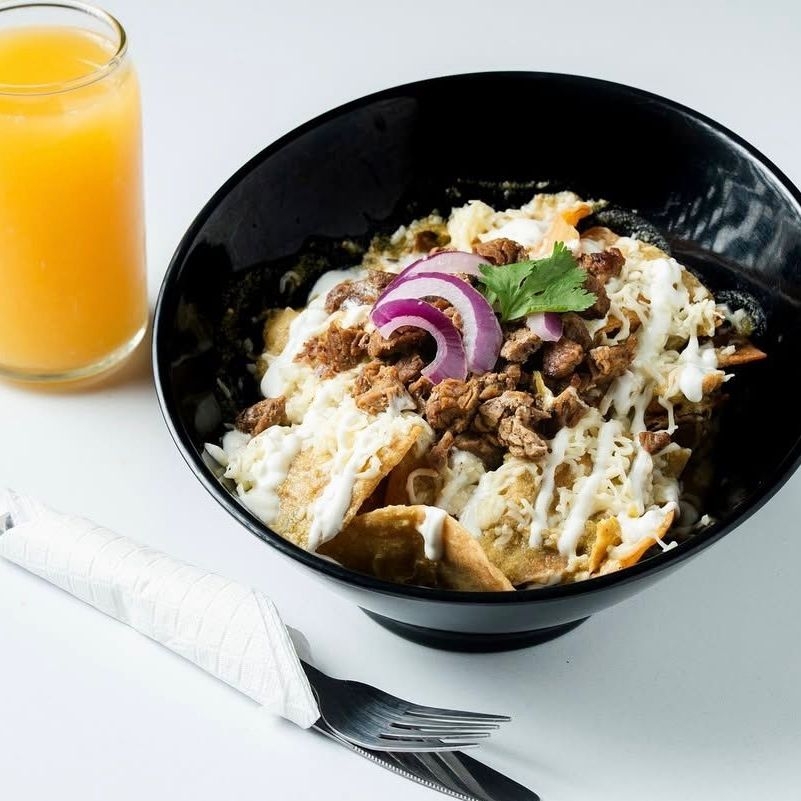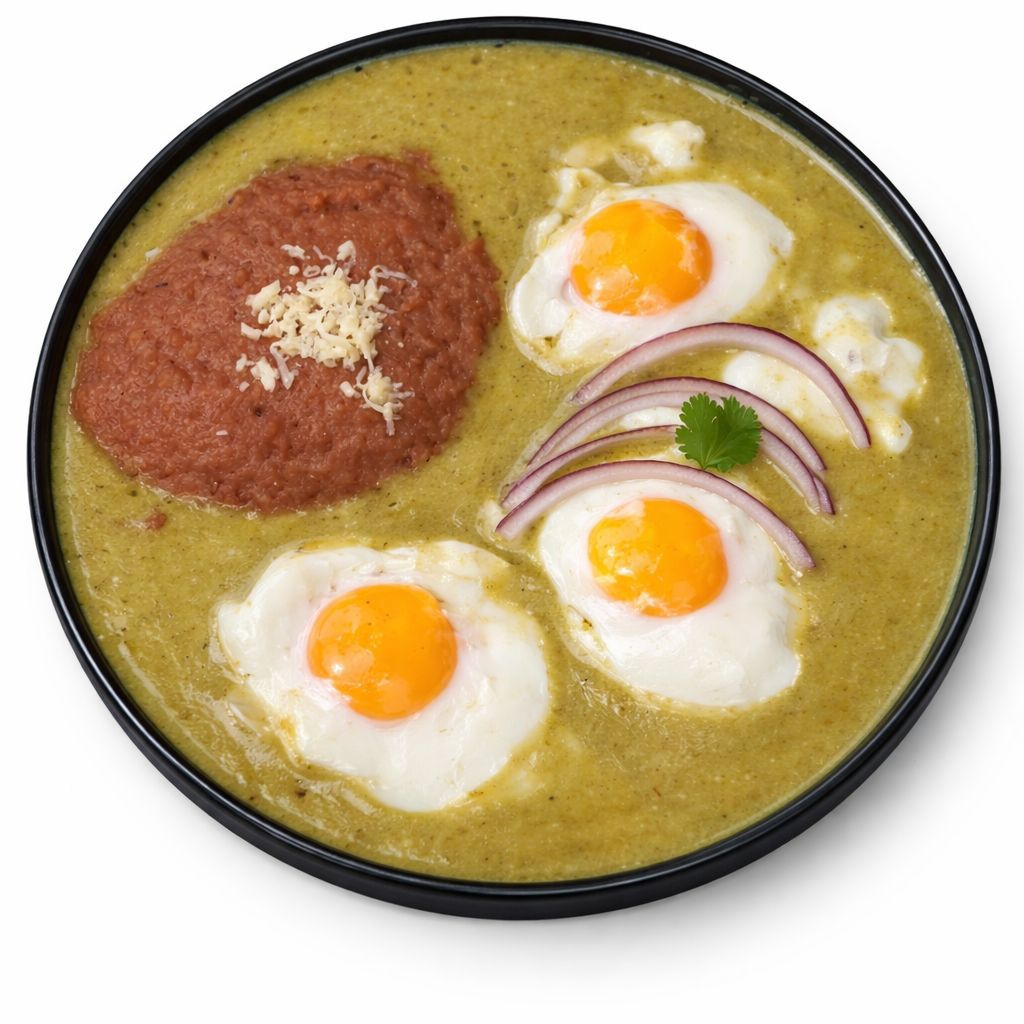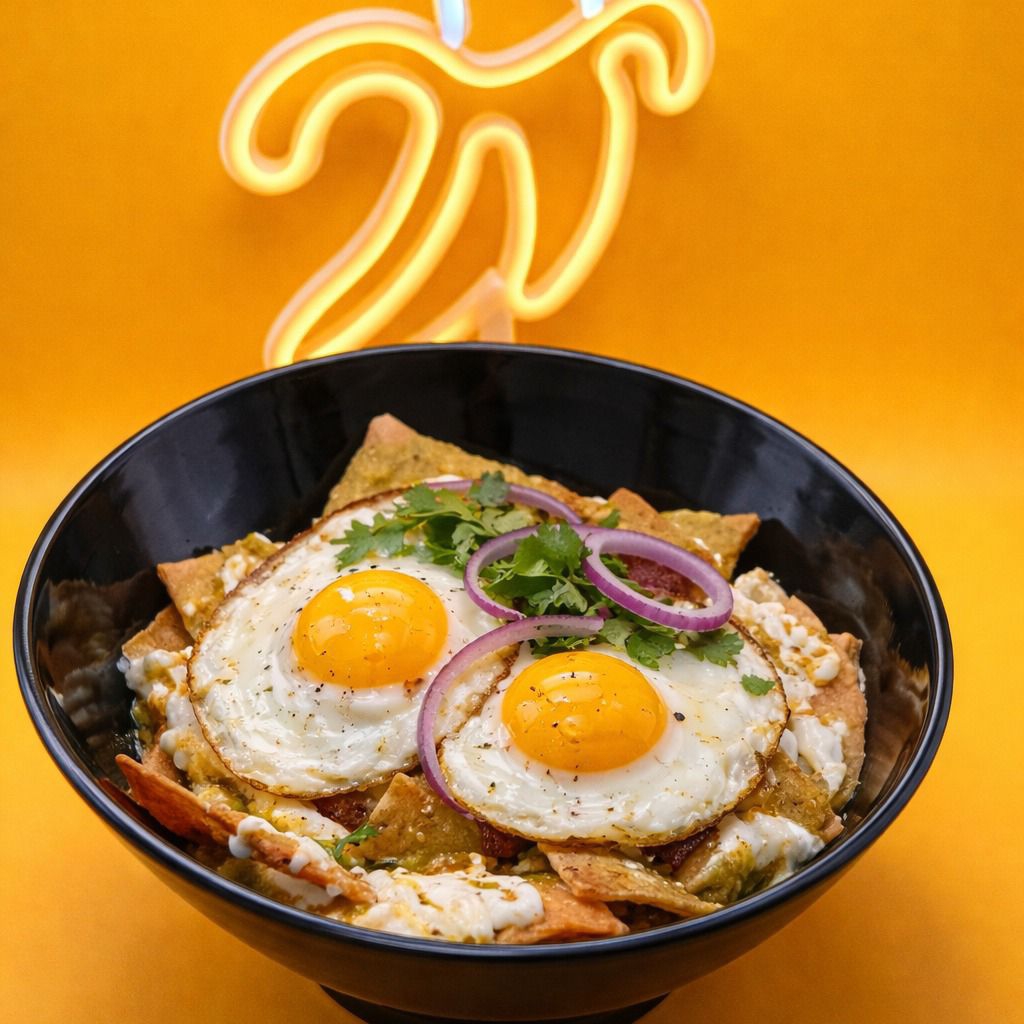 Totopos con salsa verde cremosa, frijoles, queso, crema, cebolla, cilantro y 2 huevos.