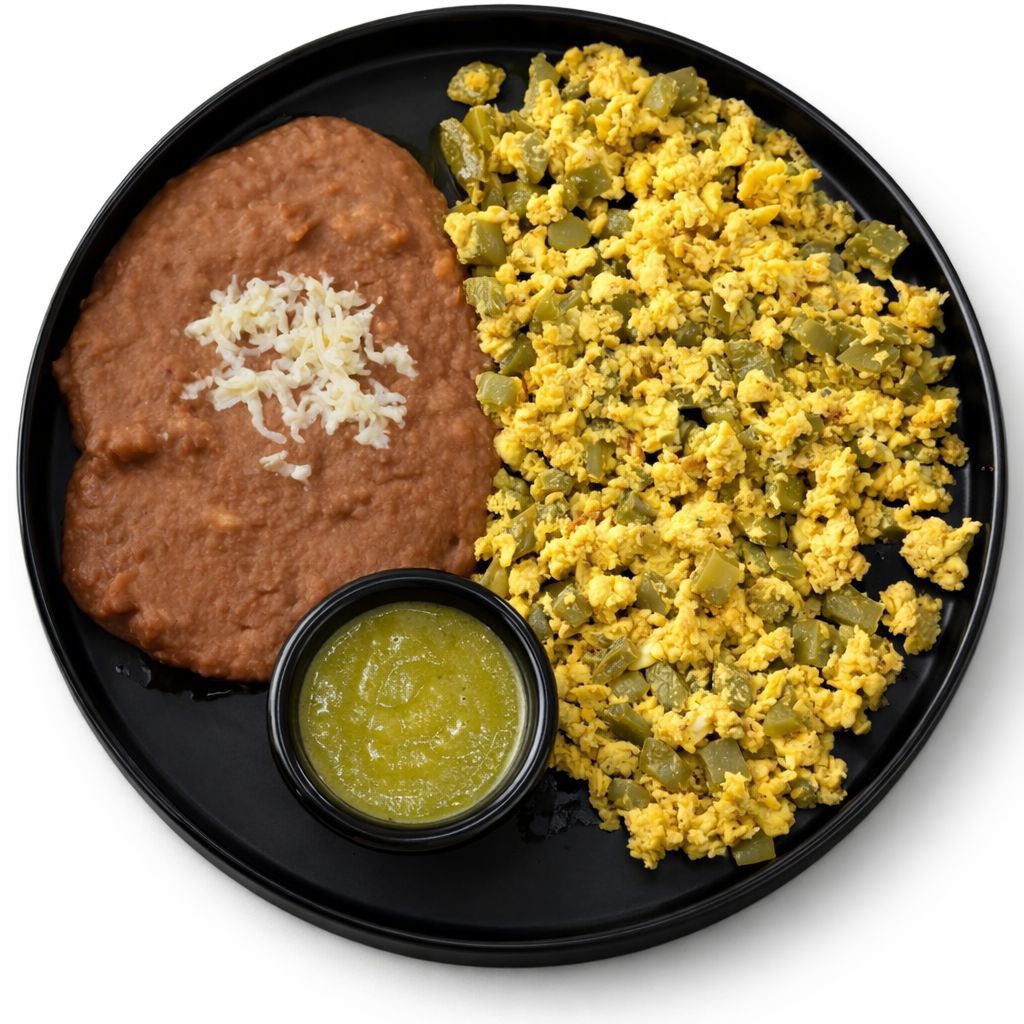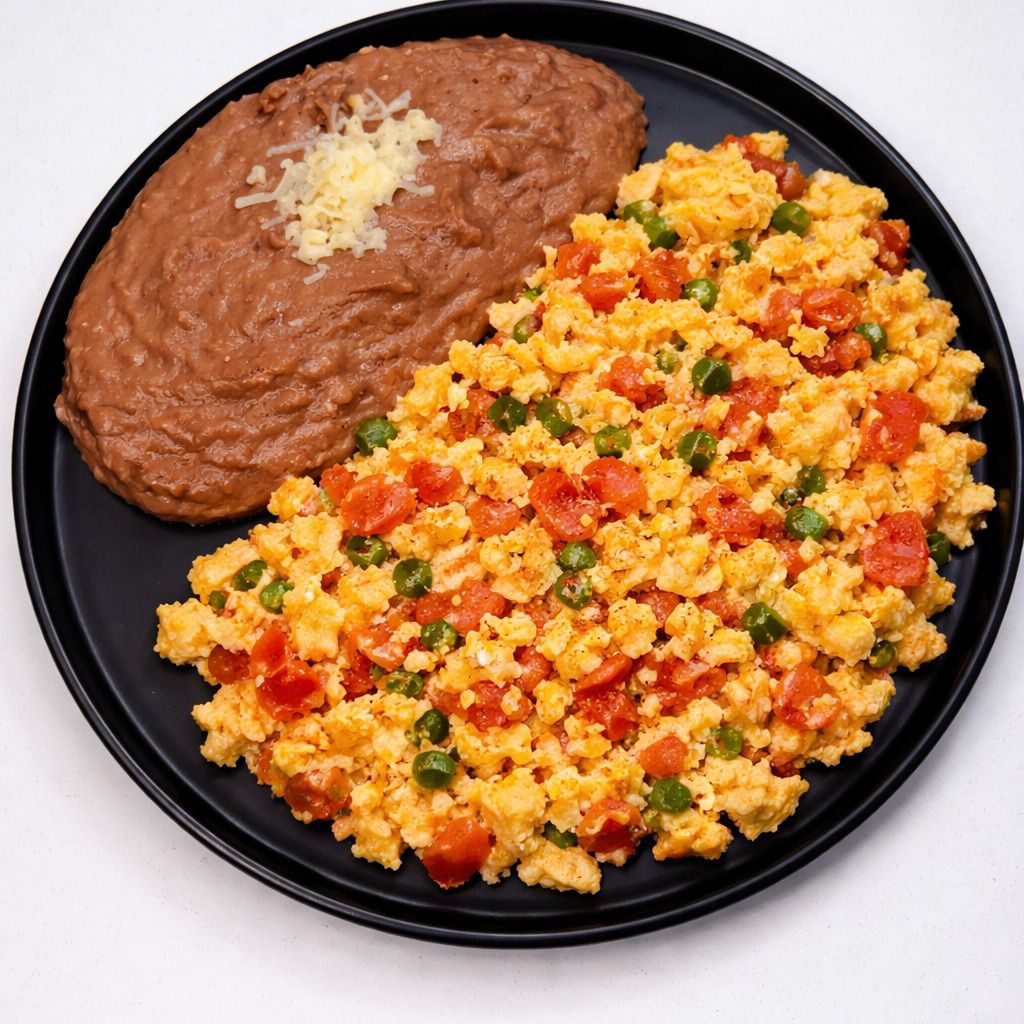 Huevo con chile, tomate y cebolla, acompañado de frijoles caseros.