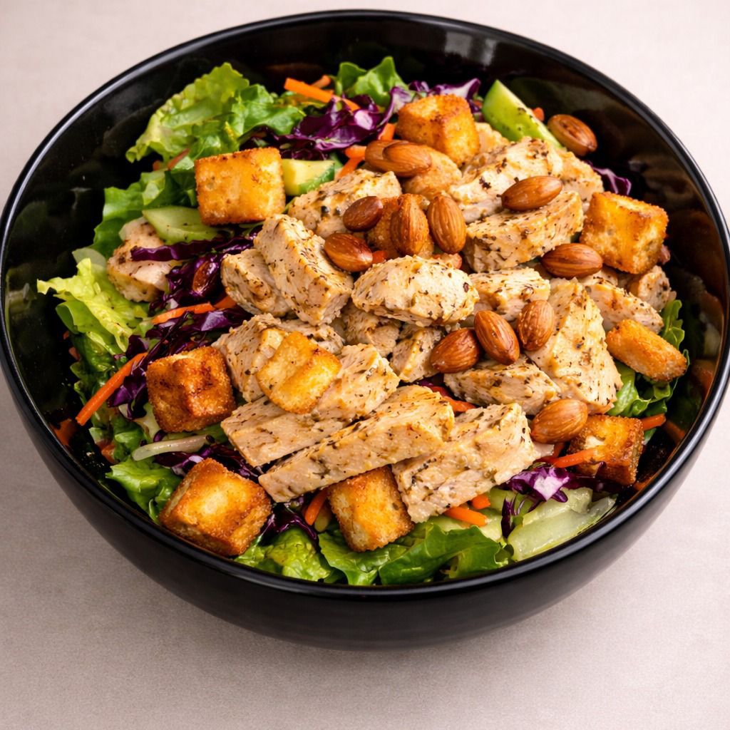 Fajita de pollo, lechuga, pepino, col morada, zanahoria, arándanos, almendras y croutones.