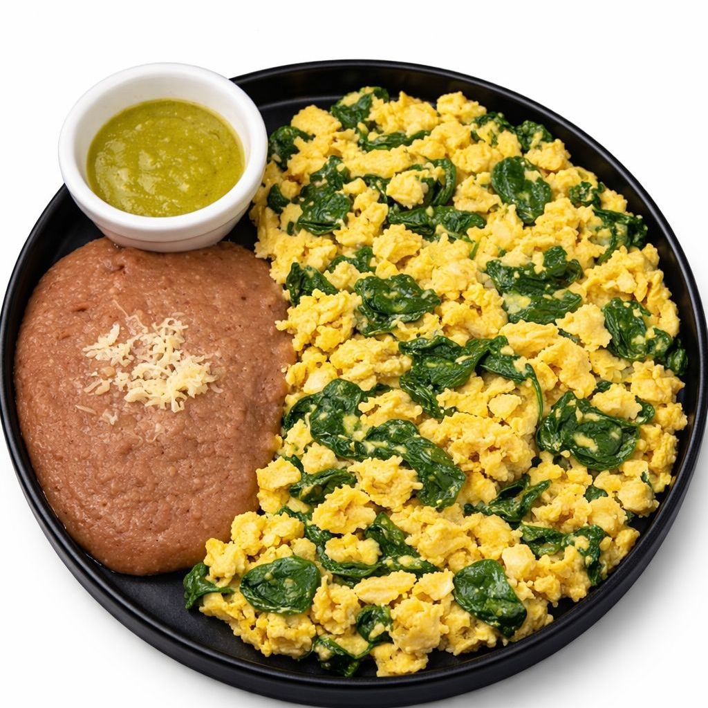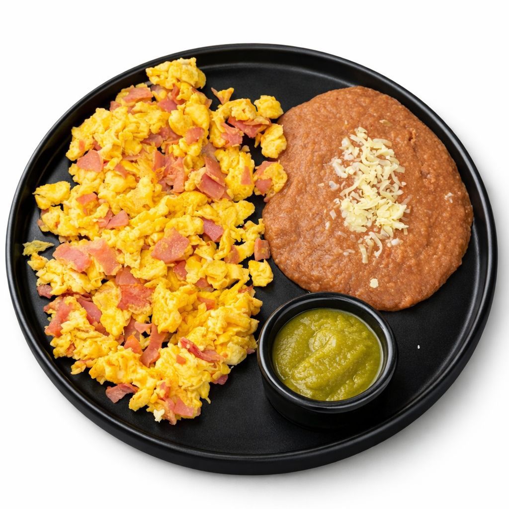 Huevo revuelto con jamón, acompañado de frijoles caseros.