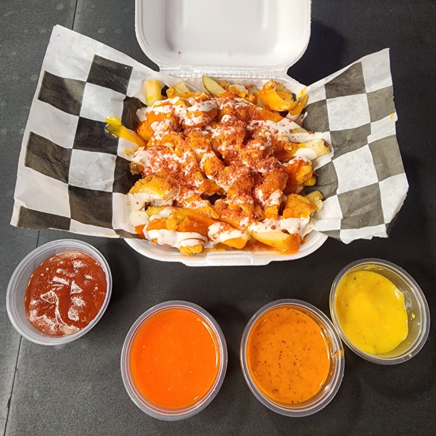 Papas a la francesa con trozos de boneles, preparadas con queso amarillo, aderezo y ranch