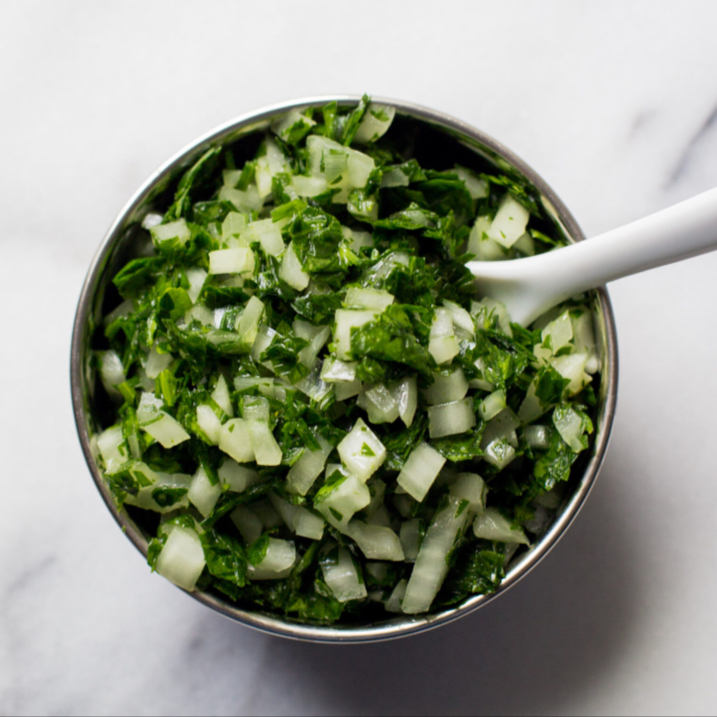 Mezcla fresca de cebolla blanca finamente picada con cilantro recién cortado. El complemento perfecto para acompañar tu rica barbacoa.