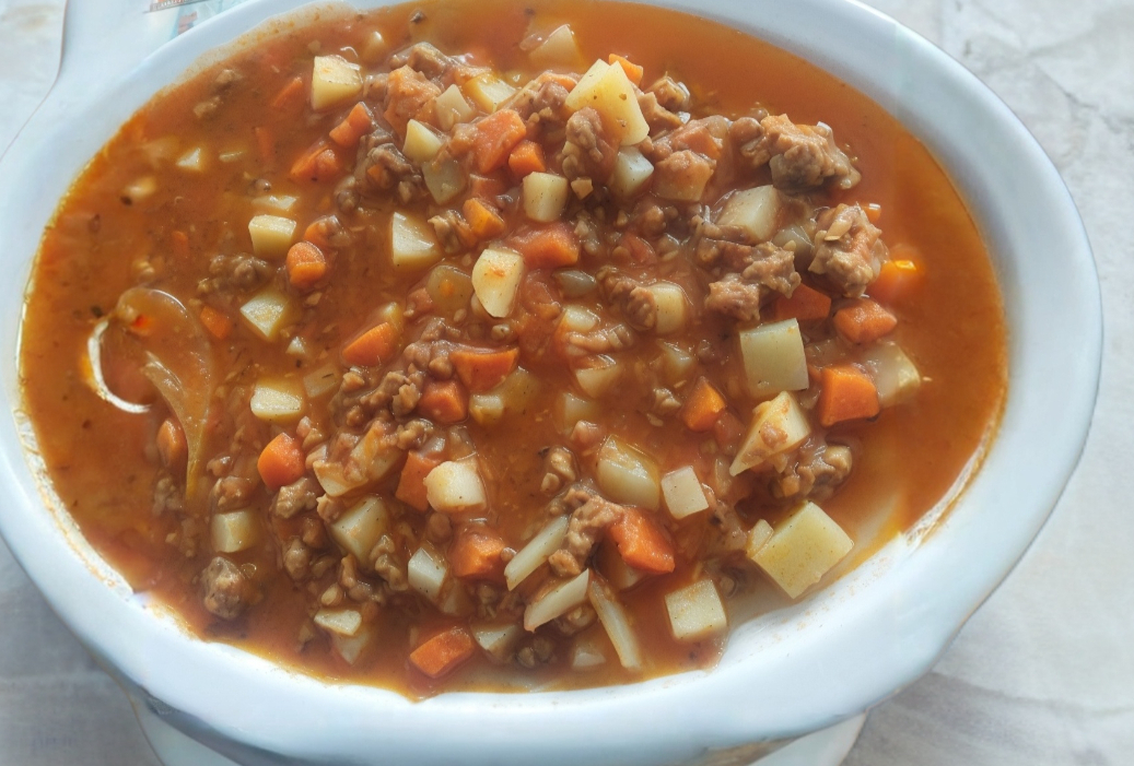 Picadillo de res acompañado de arroz, frijoles refritos, tortillas y salsa