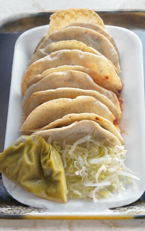 5 tacos de deshebrada en tortilla recién hecha de maiz, acompañados de lechuga y salsas de la casa