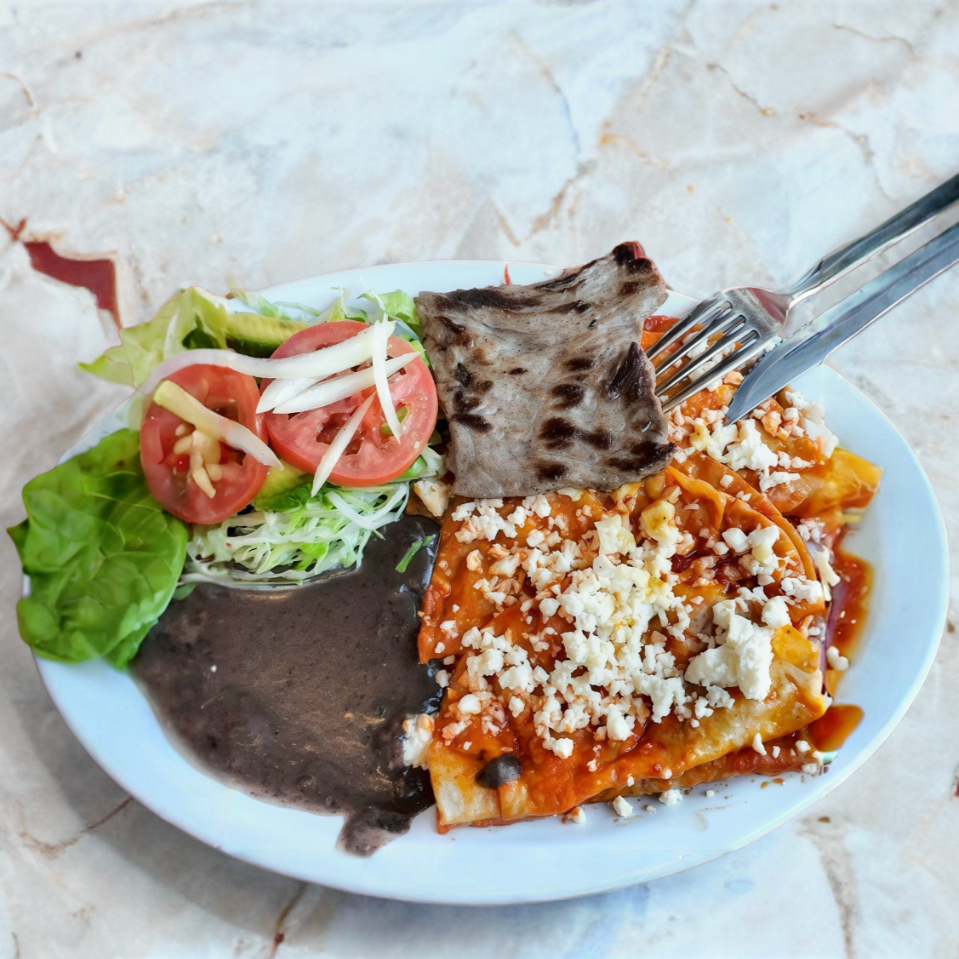 Tortilla bañada en salsa de chile seco acompañado de lechuga, tomate, aguacate, cebolla y frijoles refritos y bistec