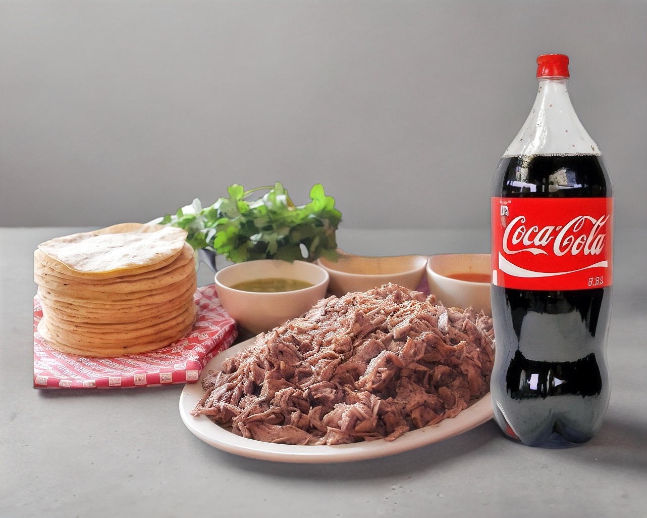 Incluye: 3/4kg de barbacoa, 1 Coca-Cola 1.25 lts, 600g tortillas de maiz, 1 botella de salsa 250ml