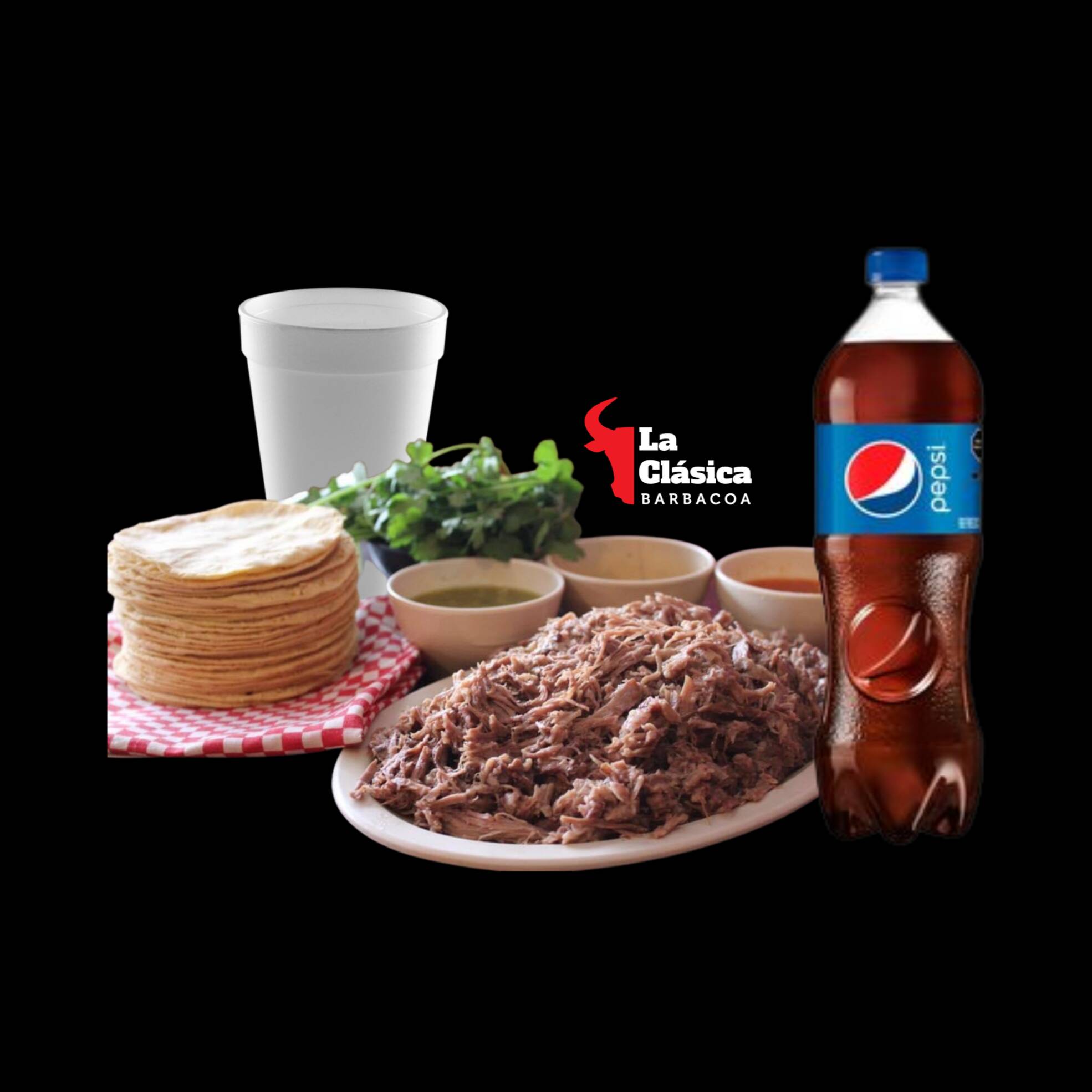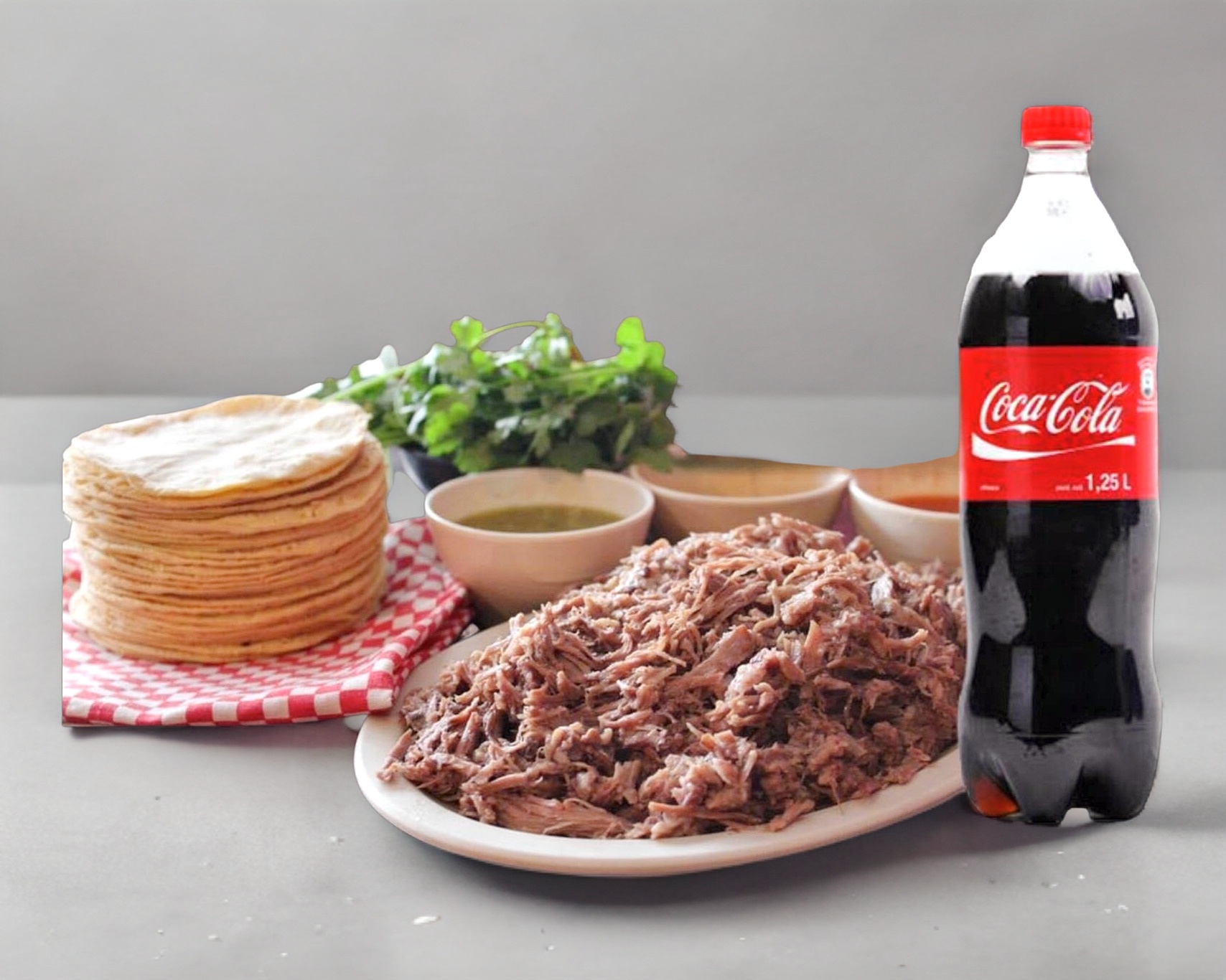 Incluye: 1/2 kg de barbacoa, 1 Coca-Cola 1.25Lts, 600g tortillas de maiz.(para max 2 personas)