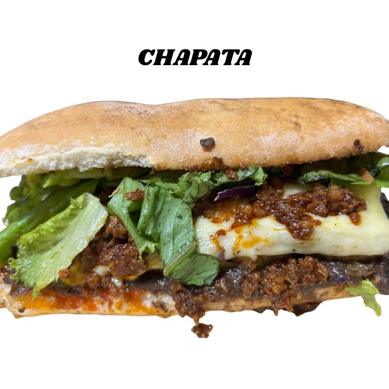 Pan chapata con milanesa de pollo, frijoles negros, queso gouda, chorizo, aguacate y lechuga acompañado con salsa matcha.