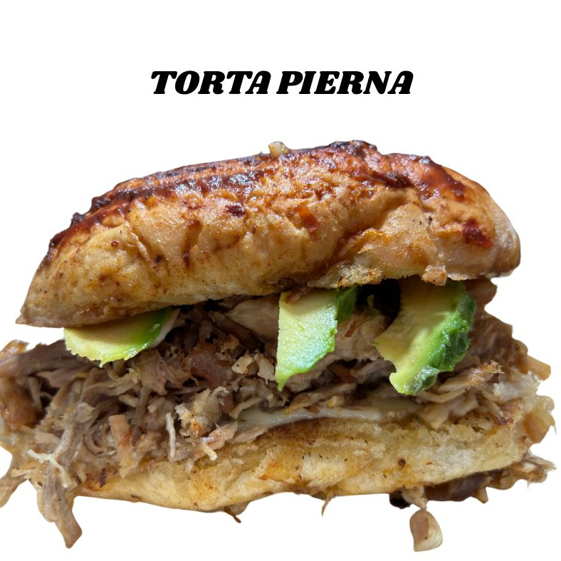 Pan telera con carne de pierna de puerco, frijoles negros, jamón, queso gouda, queso amarillo y aguacate, acompañado con salsa matcha