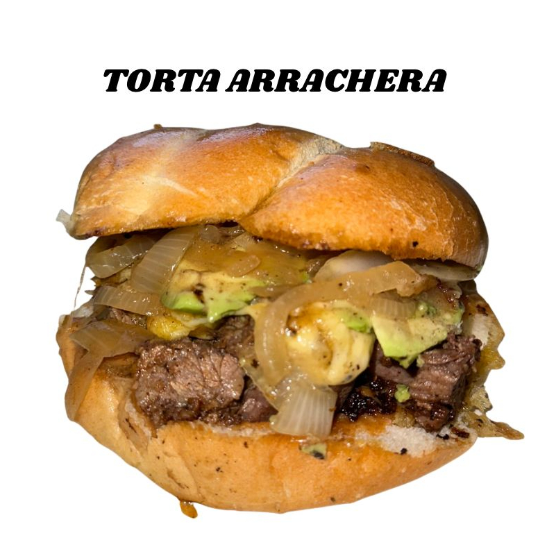 Pan telera con arrachera, frijoles negros, queso gouda, aguacate y cebolla caramelizada acompañado con salsa matcha.