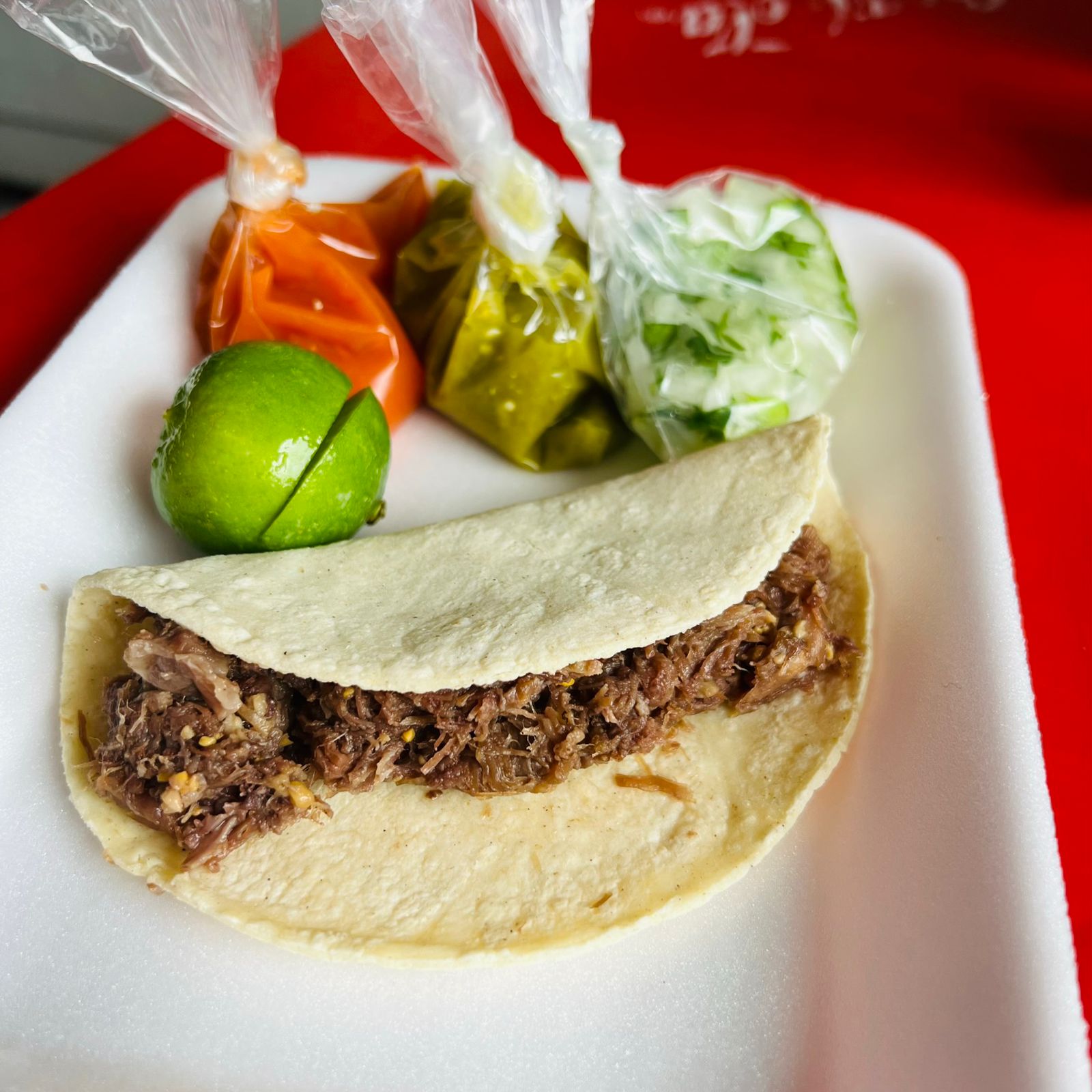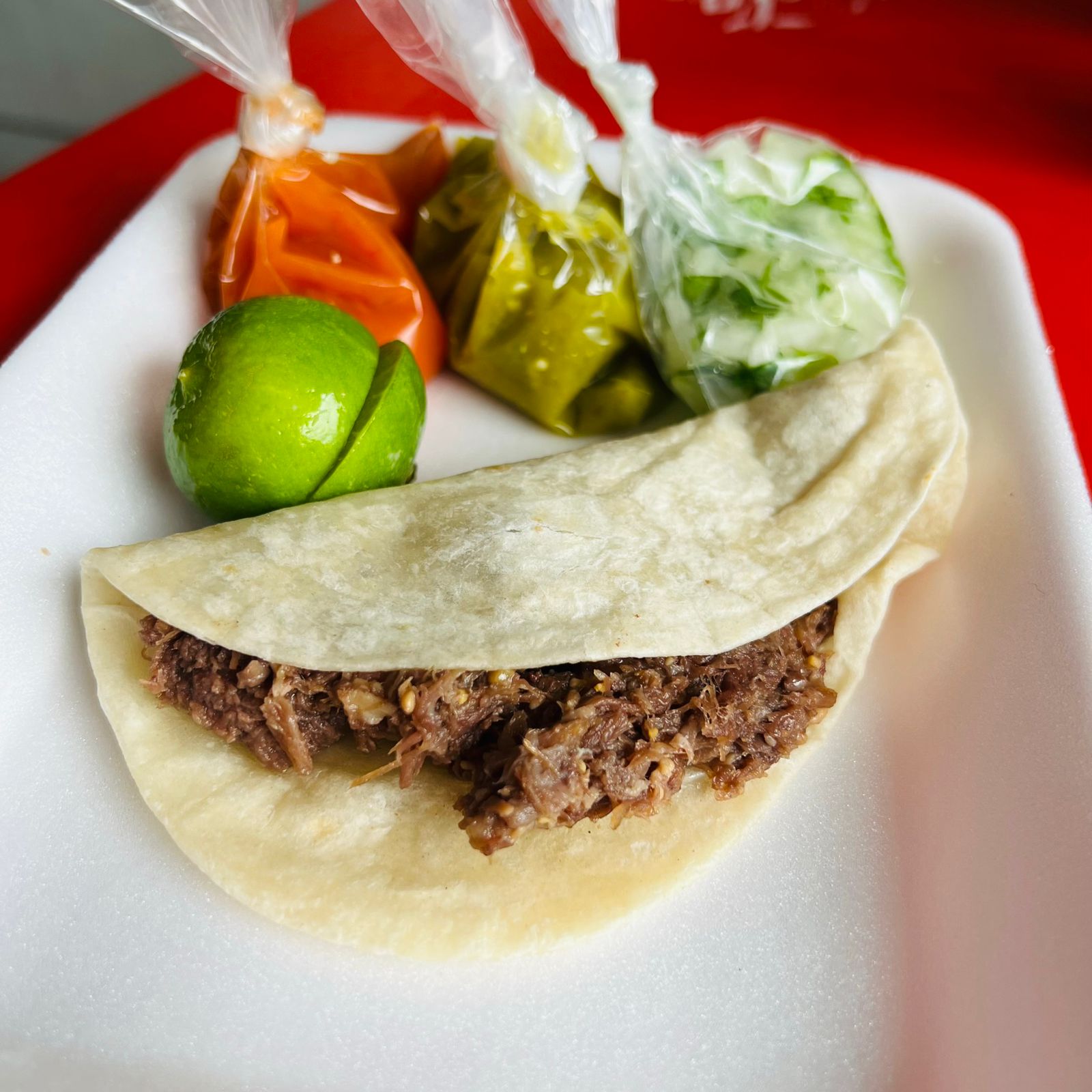 Lleva su salsas: Verde y roja con Verduras cebolla blanca limón, cilantro y 1/4 de tortillas