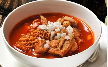 Menudo: panza o pata el cliente elige. Lleva su bolsita de cebolla y chile serrano y limon