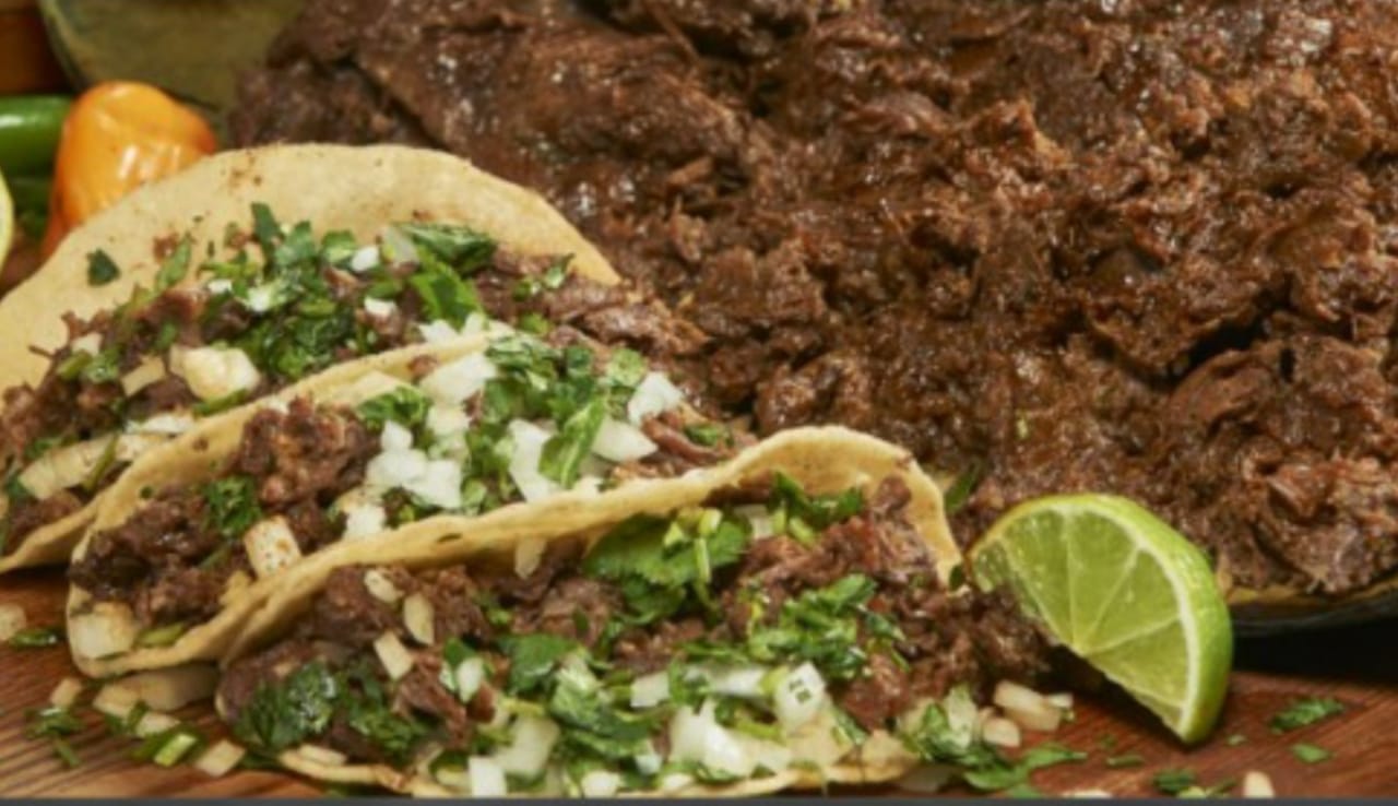Barbacoa de res, incluye tortillas, salsa verde, salsa estilo Tlaquepaque, cebolla con cilantro y limones.