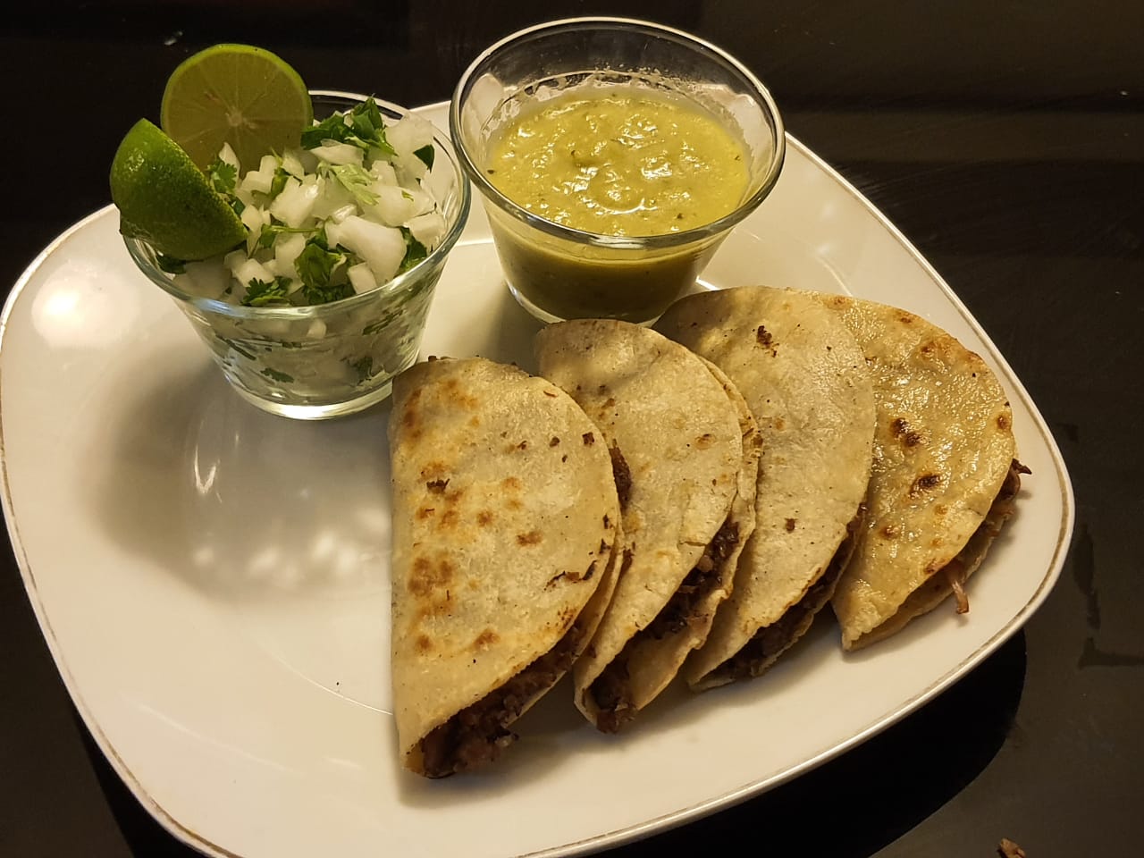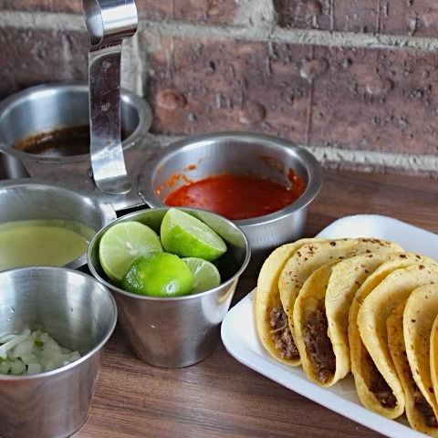 5 Tacos de barbacoa en tortilla de maíz, salsa verde, salsa estilo Tlaquepaque, cebolla con cilantro y limones.