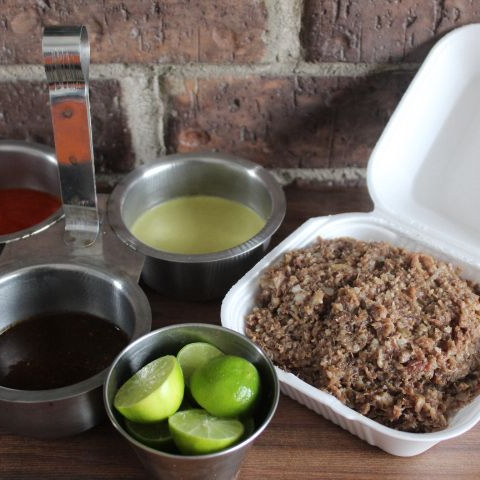 Barbacoa de res, incluye 1/4 de tortillas, salsa verde, salsa estilo Tlaquepaque, cebolla con cilantro y limones.