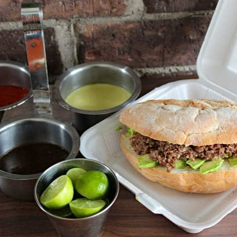Torta de barbacoa, incluye salsa verde, salsa estilo Tlaquepaque, cebolla con cilantro y limones.