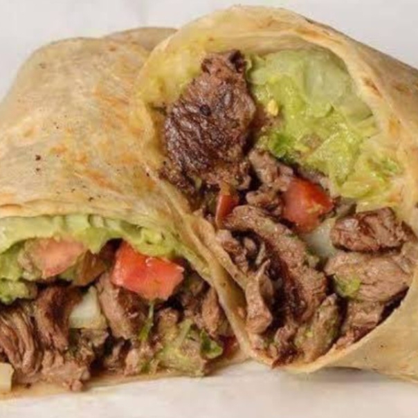 BURRITO GRANDE TORTILLA DE HARINA , CARNE , QUESO ASADERO ,AGUACATE , SALSA Y LIMON