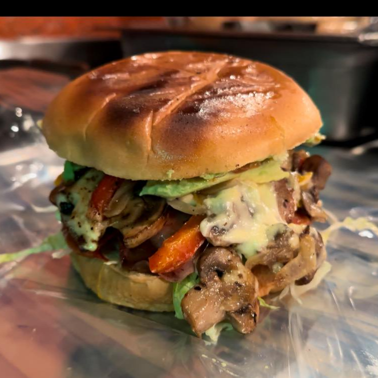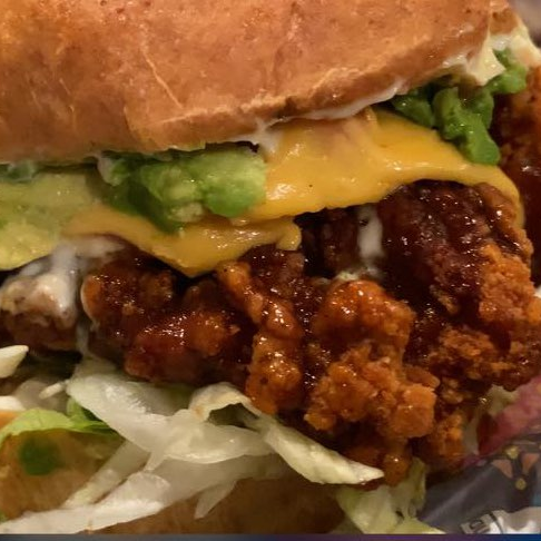 PAN BRIOCHE,PECHUGA DE POLLO EMPANIZADA BAÑADA EN LA SALSA QUE GUSTES,JAMON DE PAVO,QUESO CHEDDAR,AGUACATE,LECHUGA,TOMATE,CEBOLLA Y ADEREZOS