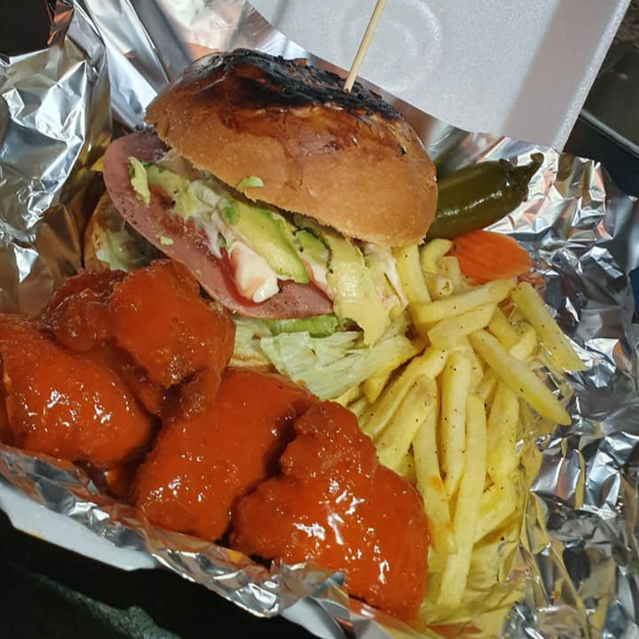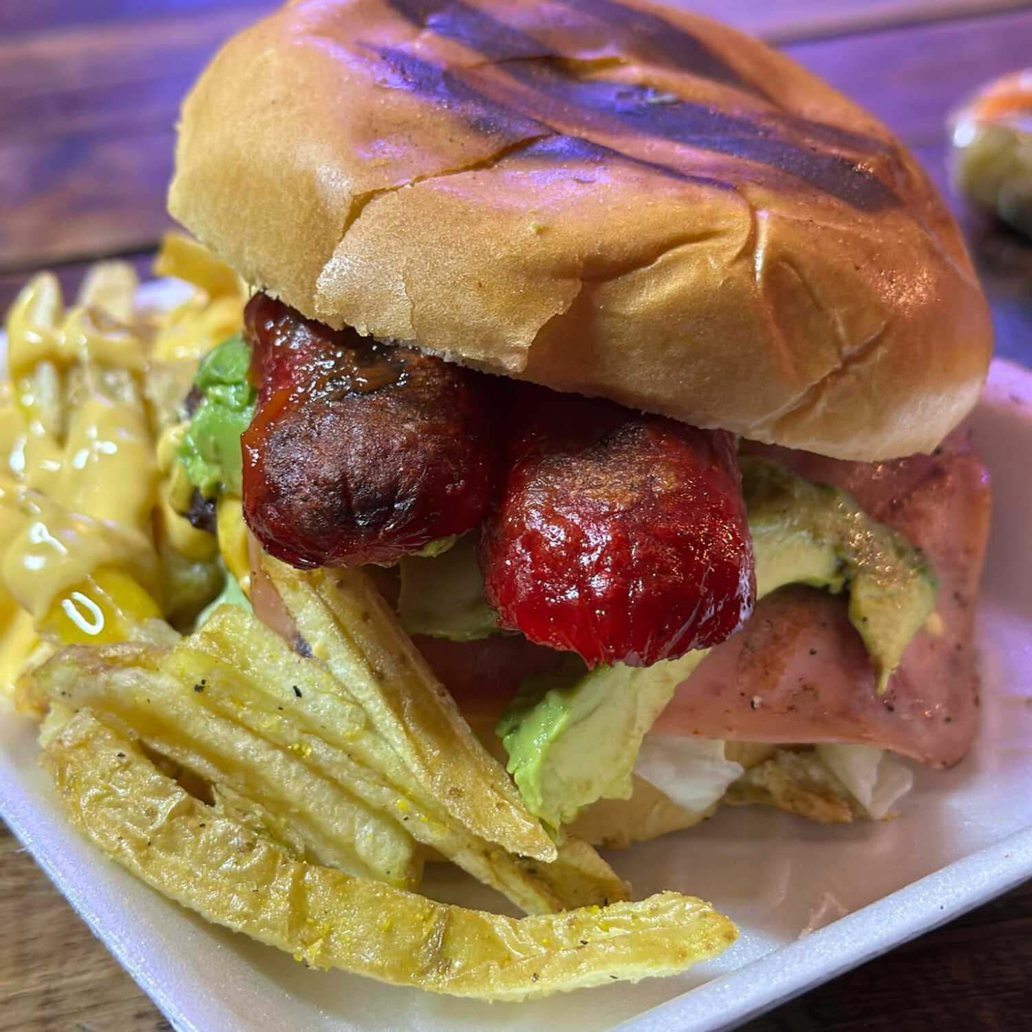 CARNE CASERA Y AL CARBON,LECHUGA,TOMATE,CEBOLLA,PEPINILLOS,QUESO CHEDEDAR,JAMON DE PAVO Y QUESO PHILADELPHIA ACOMPAÑADO DE UN INGREDIENTE A ELEGIR