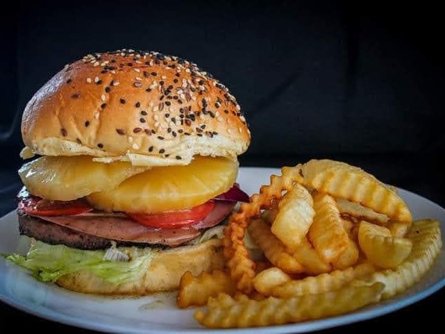 Carne (200gr) bañada en BBQ, queso, jamón, salami, lechuga fresca, tómate, cebolla morada, rodaja de piña bañada en BBQ, guacamole natural, aderezo chipotle dulce
