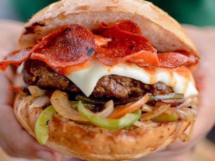 Carne (200 gr) queso, jamón, salami lechuga fresca, tomate cebolla morada, aguacate, cátsup y mayonesa