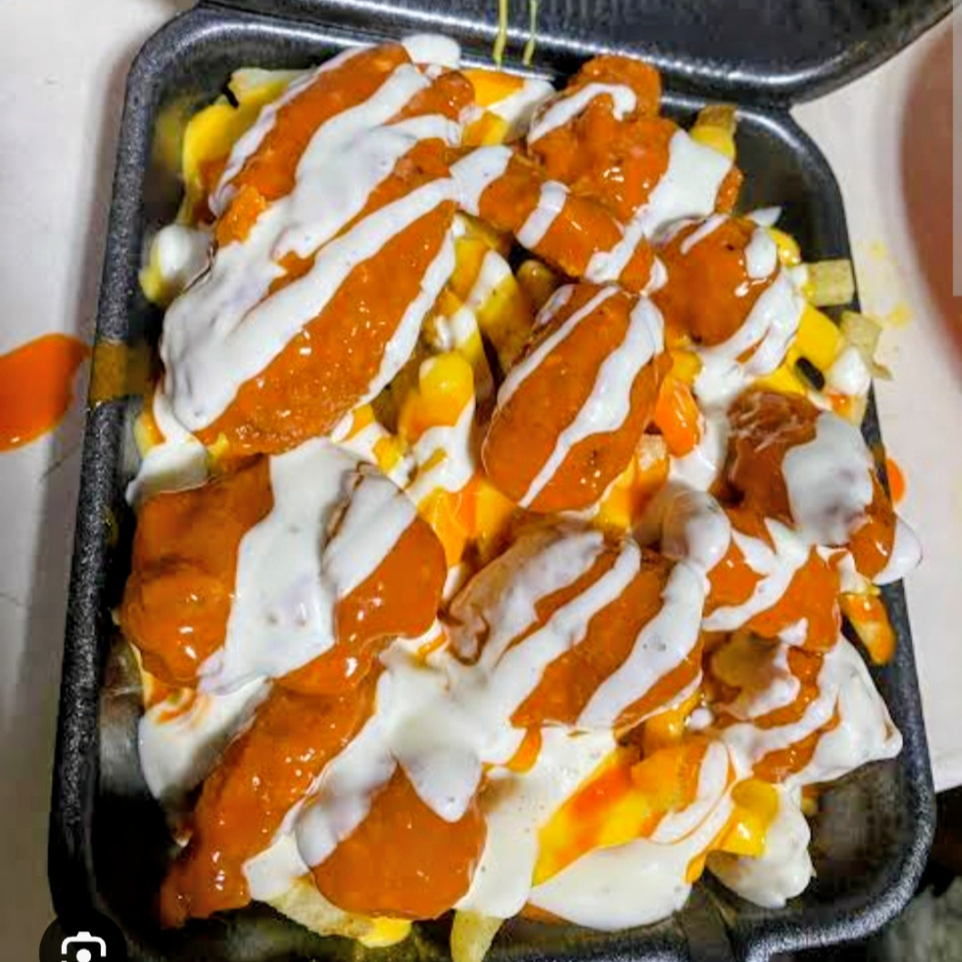 Cama de papas con queso y arriba boneles con salsa y ranch