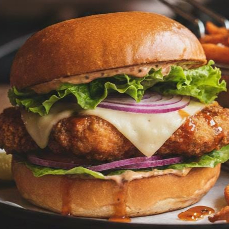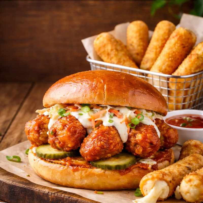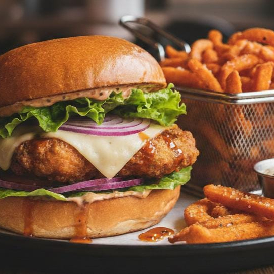 Hamburguesa de boneless bañados en tu salsa favorita, acompañados de dedos de queso,aderezo de tu preferencia.