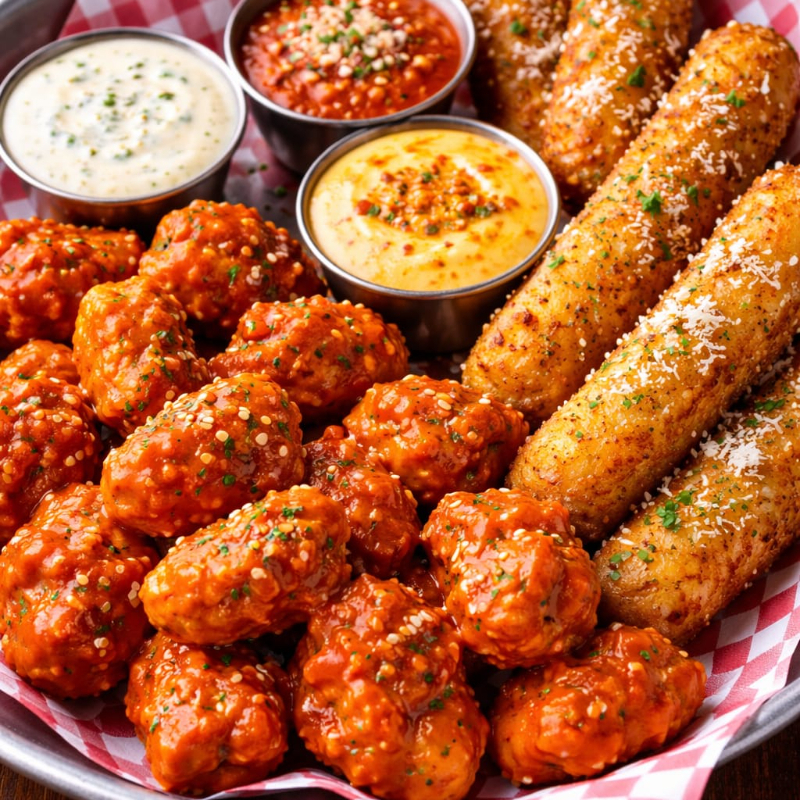 Ricos boneless bañados en tu salsa favorita,aderezo y dedos de queso mozarella