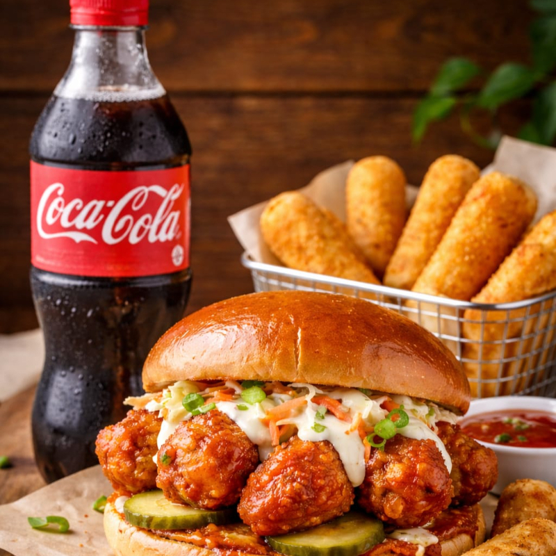 Hamburguesa de boneless bañados en tu salsa favorita, acompañados de dedos de queso,aderezo de tu preferencia y refresco