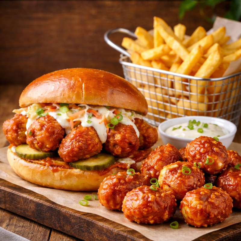 Hamburguesa de boneless bañados en tu salsa favorita, acompañados de papas a la francesa y aderezo de tu preferencia.
