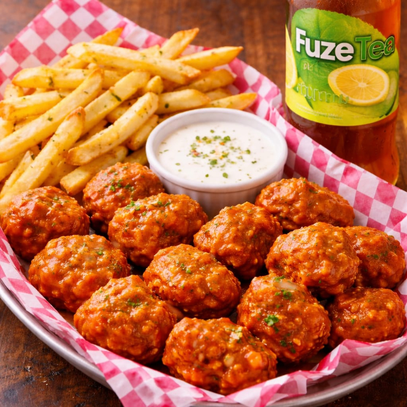 Ricos boneless bañados en tu salsa favorita, acompañados de papas a la francesa, aderezo de tu preferencia y Fuze tea de limon 600ml